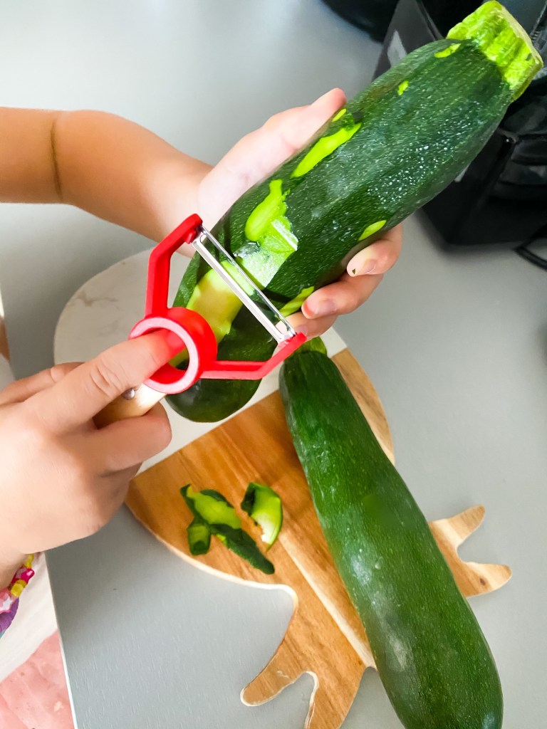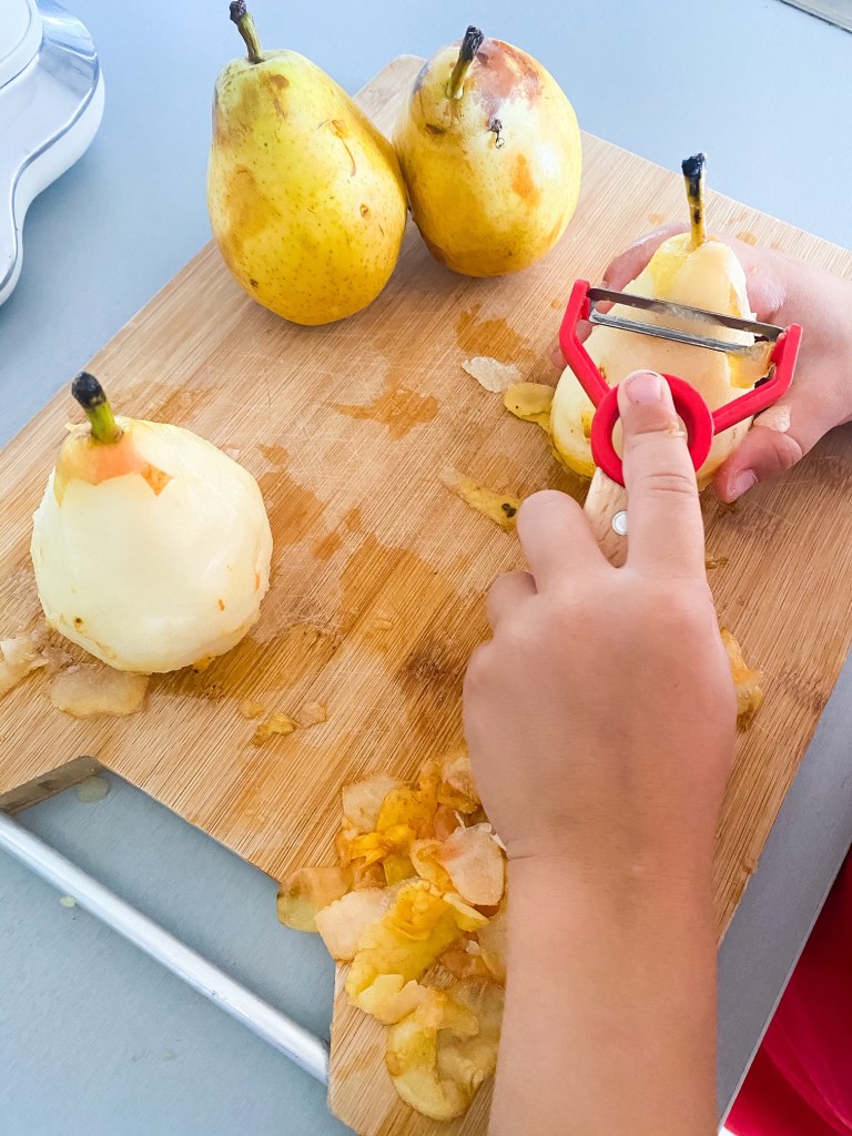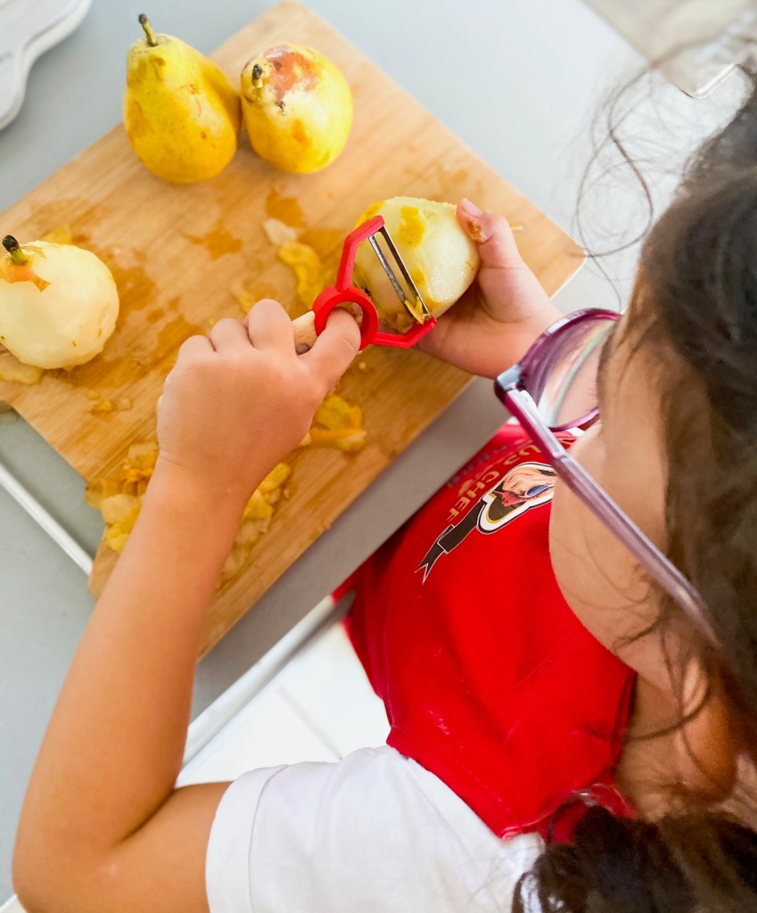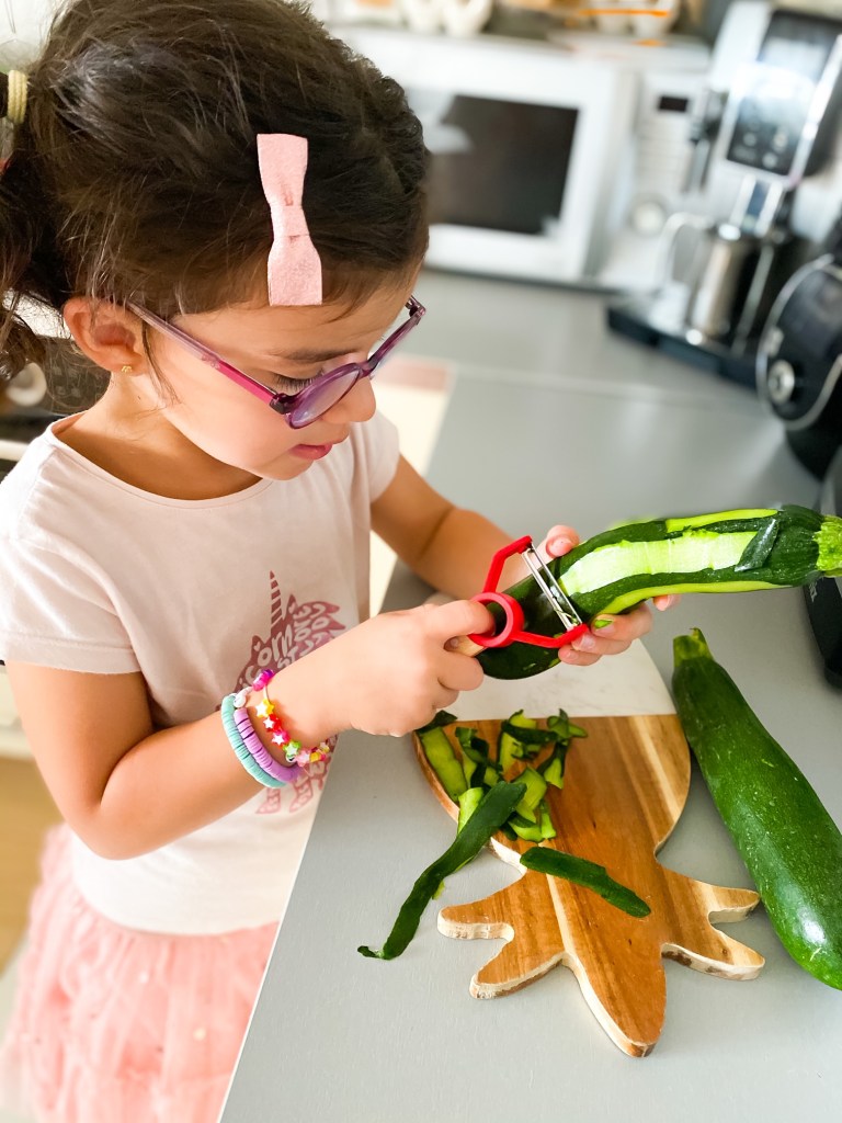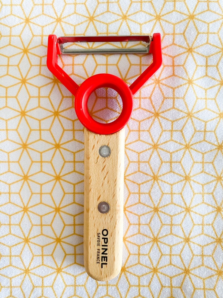 La fameuse marque de couteau Opinel a créé une gamme d’ustensiles de cuisine 100% kids-friendly, baptisée Le Petit Chef. Tessa me réclame souvent d’éplucher les légumes mais j’ai toujours peur qu’elle se coupe un bout de doigt avec mon économe classique. Du coup, je ne lui laissais pas faire cette tâche, mais avec cet ustensile je suis plus sereine et je la laisse faire le commis de cuisine. La lame, en acier inoxydable, est super efficace. La première fois que Tessa l’a pris en main, elle n’a pas eu besoin de forcer pour éplucher sa courgette. Il épluche même mieux que mon économe d’adulte. Je pense que je m’en servirai aussi. Ce qui est aussi hyper pratique c’est son anneau pédagogique qui aide l’enfant à bien positionner ses doigts pour manipuler correctement l’ustensile.