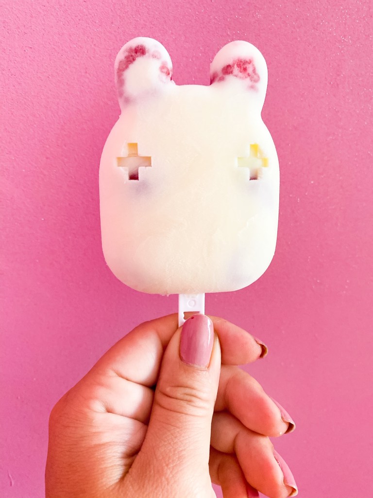 - Répartissez la préparation dans les moules, ajoutez les bâtons en silicone et placez-les au congélateur 3h au moins.