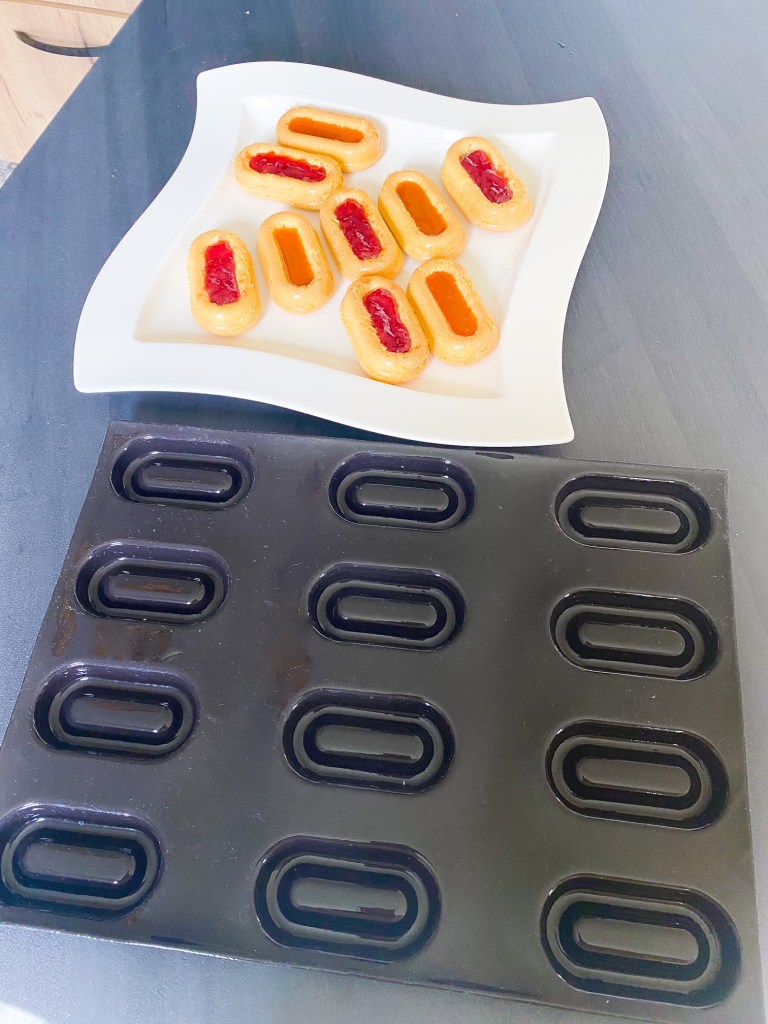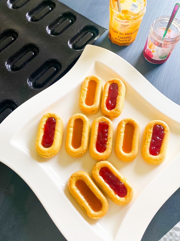 On commence ce 1er jour de vacances par la préparation d’un bon goûter pour les filles avec mon nouveau moule Guy Demarle, le barquette savarin, que m’a conseillé Jenn Cuisine. J’ai préparé une pâte façon génoise aromatisée à la fleur d’oranger. Une fois démoulé, j’ai garni mes petits gâteaux avec de la confiture de fraise et du caramel au beurre salé. Un régal !