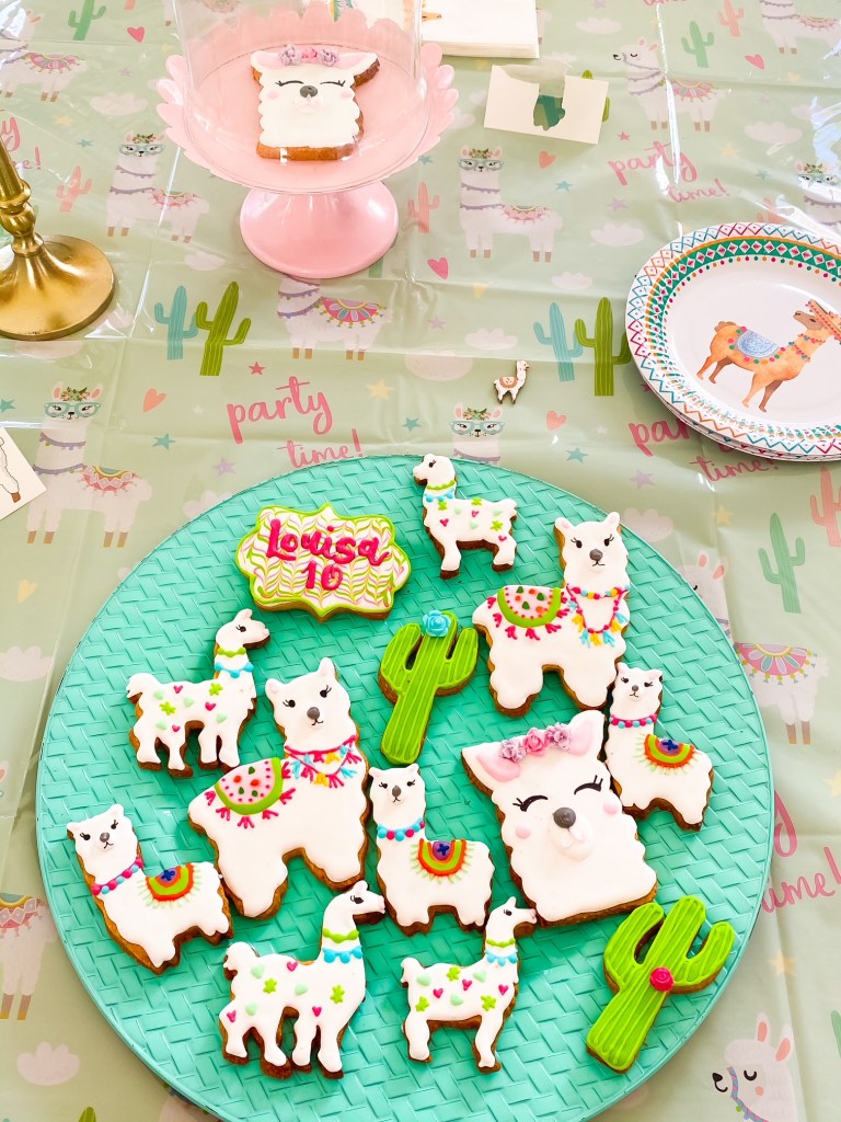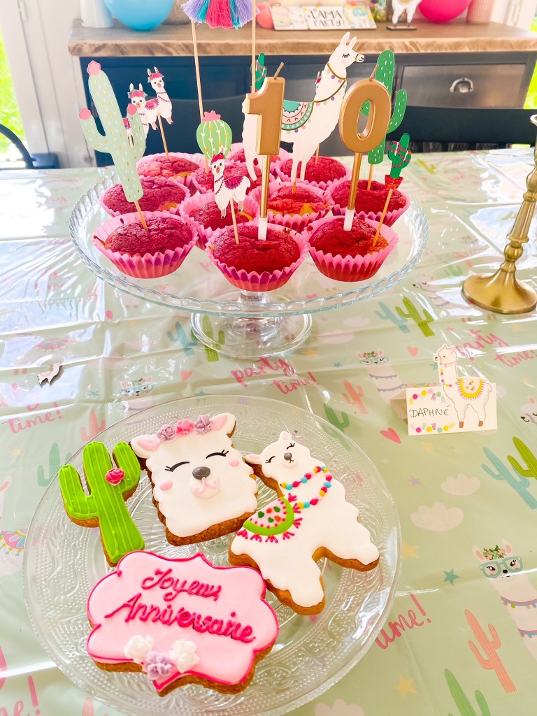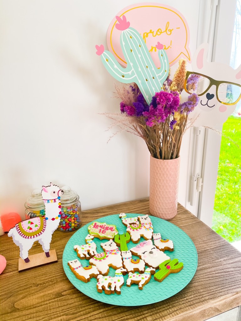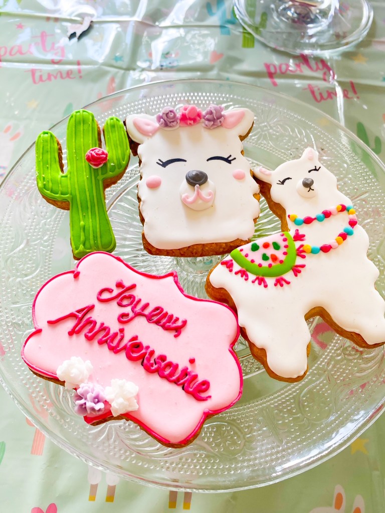 Pour le gâteau, nous avons décidé de faire de cupcakes roses que j’ai décoré de jolis cake toppers en bois. Et comme pour chaque fête, j’ai aussi fait appel à Happylyparty pour confectionner de beaux sablés en forme de lama et de cactus. Comme d’habitude, Sandrine a parfaitement respecté le code couleur. Ces biscuits étaient tellement beaux qu’on n’avait quasiment pas envie d’en manger. Cette cake designer et vraiment super douée. Une vraie artiste ! N’hésitez pas à la contacter, elle réalisera n’importe quel thème avec soin. Elle livre partout en France.