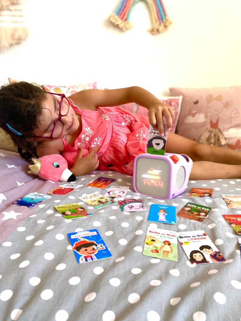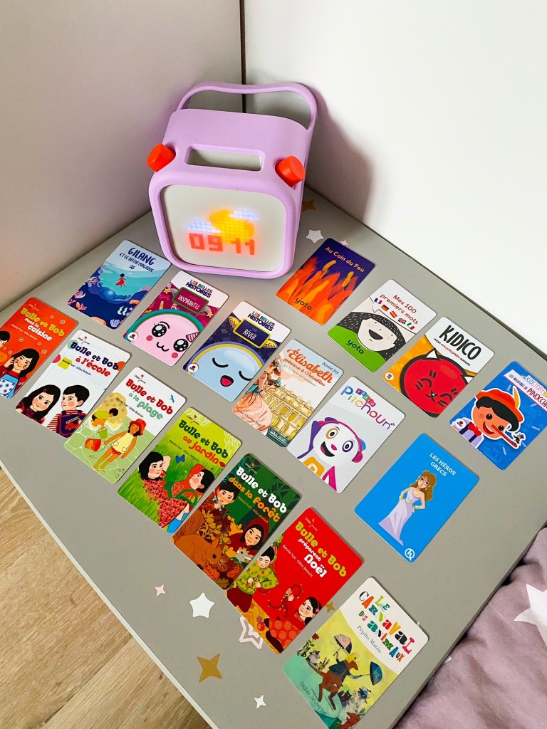 Le Yoto Player est un lecteur audio intelligent multifonctions. A la différence des autres boîtes à histoires que l’on a pu tester, le Yoto Player fonctionne avec des cartes audio à insérer dans le lecteur. Plus qu’une boîte à histoires, cette enceinte permet notamment d’écouter des contes, de la musique, la radio, des podcasts, des activités… Vous pouvez même personnaliser des histoires en les enregistrant vous-même. Parallèlement aux cartes, l’application Yoto propose aussi d’autres contenus gratuits comme des exercices de relaxation, des sons pour s’endormir ou de nouvelles histoires. L’application est régulièrement enrichie et mise à jour. C’est un gros avantage !