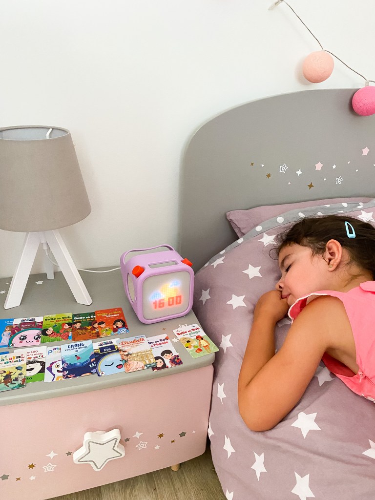 Le Yoto Player intègre également une fonction horloge pédagogique et une veilleuse. Depuis qu’elle l’a reçu, Tessa ne le quitte plus. Elle le trimballe partout avec la poignée de transport de la housse de protection en silicone.