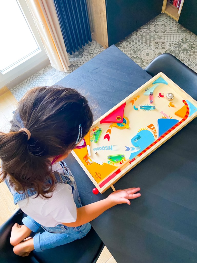 Qui n’a jamais kiffé jouer au flipper quand il était gamin ? Moi la première alors vous imaginez ma joie quand on a reçu le flipper en bois de la marque Janod. Il est d’une beauté ! Son design légèrement rétro est canon tout comme ses couleurs vives. Le flipper est bourré d’obstacles : une cloche, des élastiques rebondissants, des caches et pièges mais aussi une roue. Depuis qu’on l’a, on organise régulièrement des parties enflammées en famille.