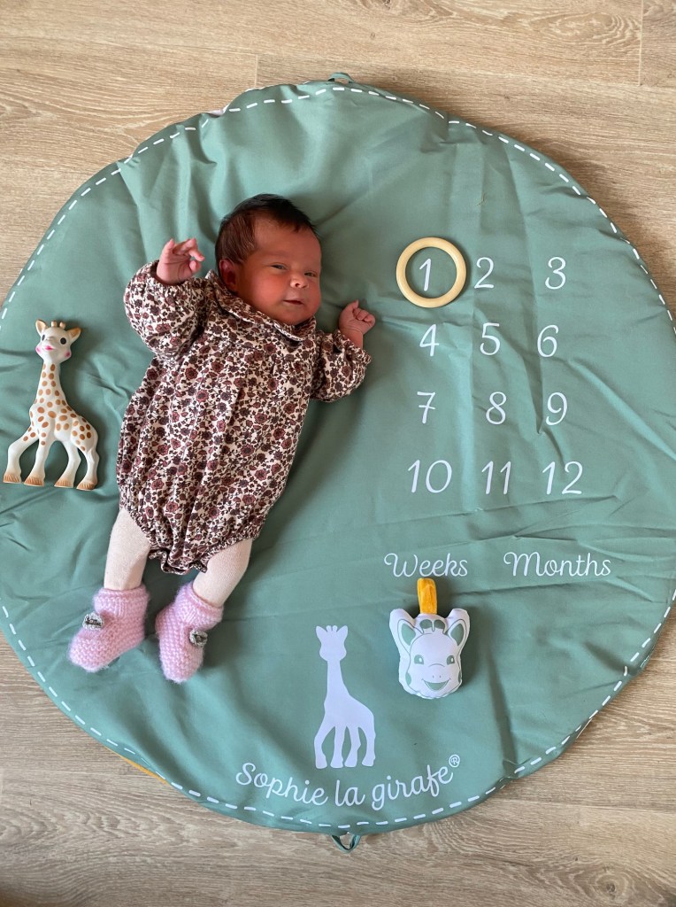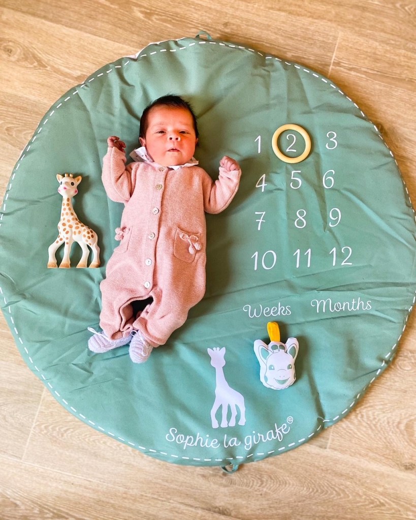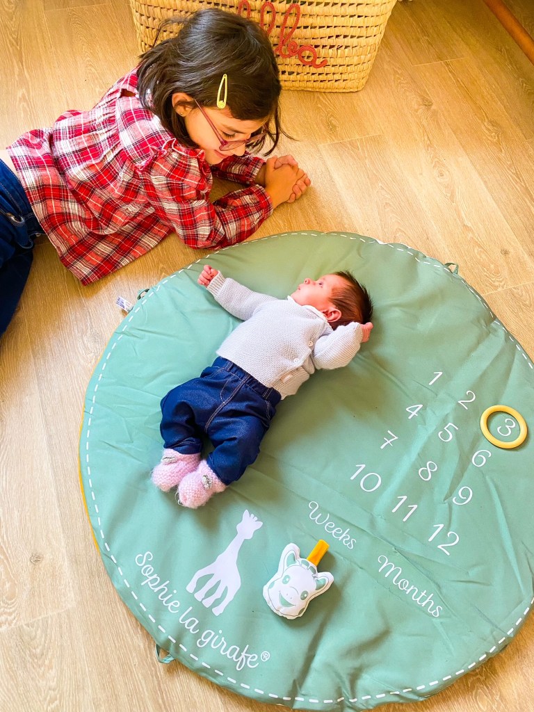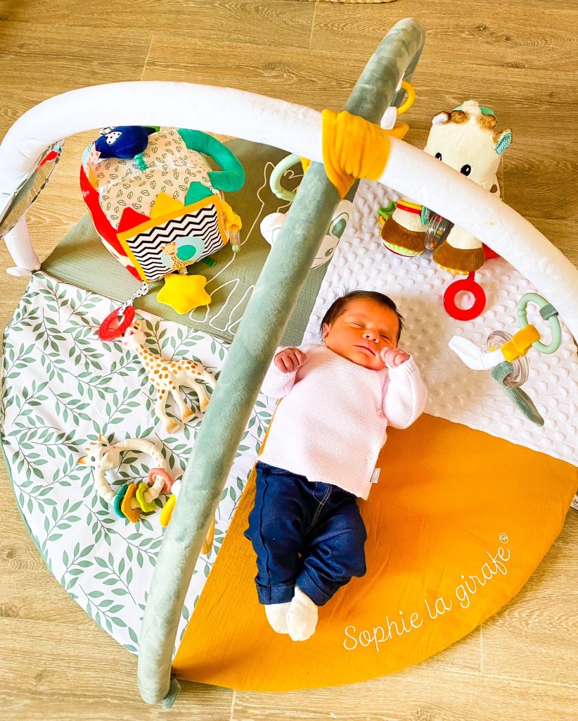 Trop chouette ce tapis 2 en 1 ! Avec une face tapis d’éveil classique comprenant une arche d’activités pour développer l’éveil et la motricité de bébé (miroir, grelot, anneau de dentition, papier froissé…) et une face pour photographier l’évolution de bébé, semaine après semaine et mois après mois. Pour cela, on réutilise certains éléments des arches d’activités. J’adore l’idée de pouvoir immortaliser chaque étape de la vie de notre petite Alba et de garder de beaux souvenirs.