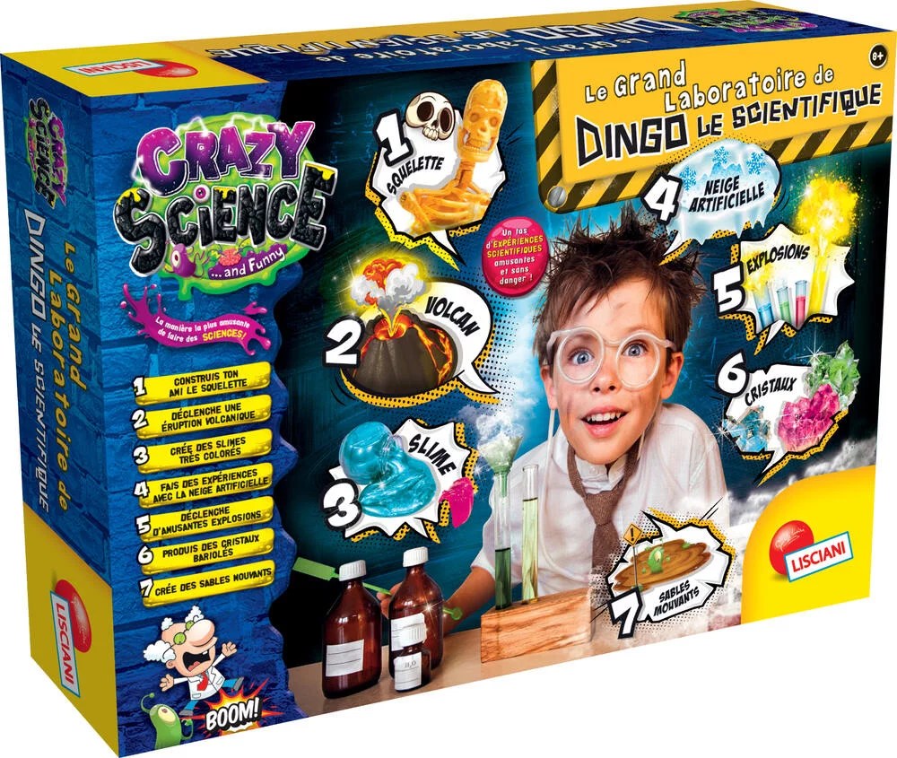 Avec le Grand laboratoire de Dingo le scientifique, votre enfant va se transformer en savant fou et réaliser des expériences spectaculaires mais sans danger ! Il pourra déclencher une éruption volcanique et d’amusantes explosions, construire un squelette, créer des slimes, faire des expériences avec de la neige artificielle, produire des cristaux et créer des sables mouvants.