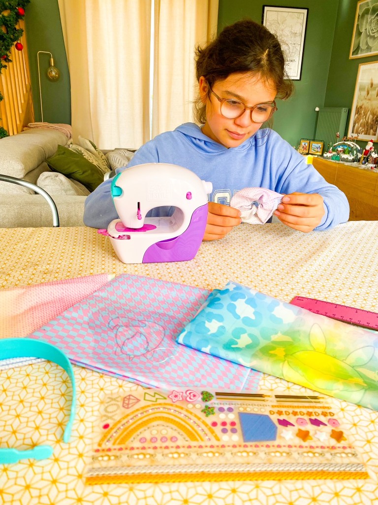 Du coup avec Louisa, on a voulu la tester avant de la glisser sous le sapin. Elle est super simple d’utilisation même pour nous qui sommes novices en la matière. Elle dispose d’un système de cartouche unique et très innovant où il n’y a pas besoin de procéder à l’enfilage de l’aiguille. De plus, cette machine est dotée de capteurs intelligents. Les apprentis stylistes n’ont donc pas à faire de point d’arrêt. La machine est vendue avec du matériel et patrons en tissus qu’il ne reste plus qu’à découper pour créer un sac, un serre-tête, un étui à lunettes, une trousse et un chouchou. Vous pouvez ensuite customiser vos créations grâce aux feuilles de transferts textiles.