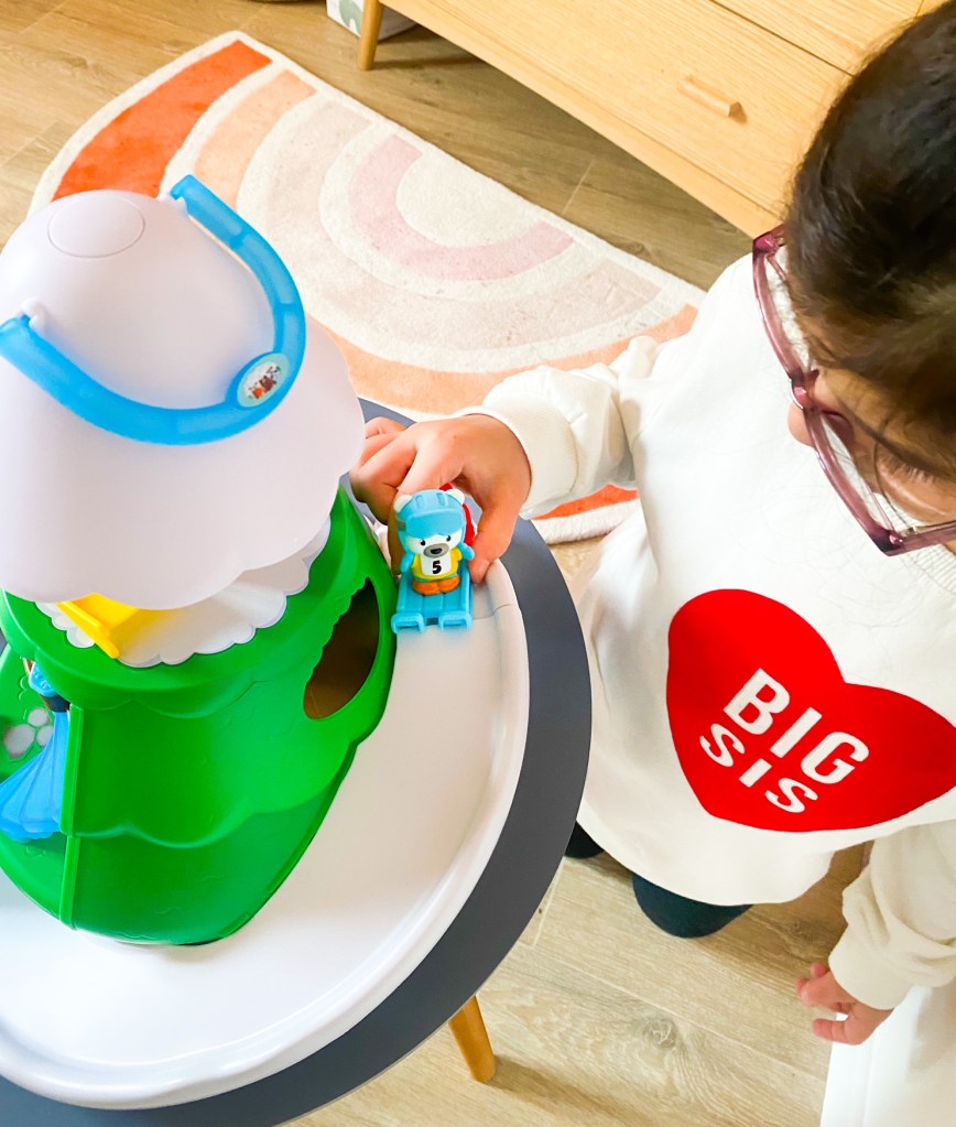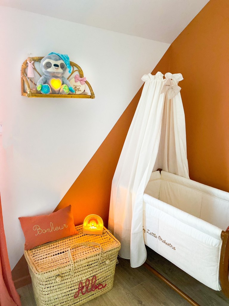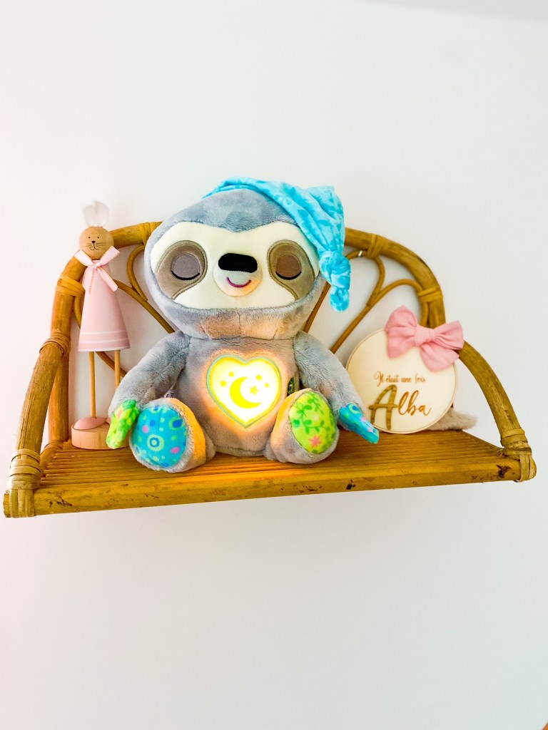 C’est ce que chantonne ce petit paresseux trop mignon de chez VTech. C’est une adorable peluche animée qui apaise notre petite Alba et l’accompagne au pays des rêves
