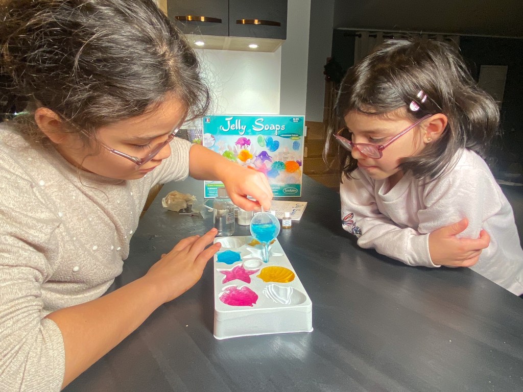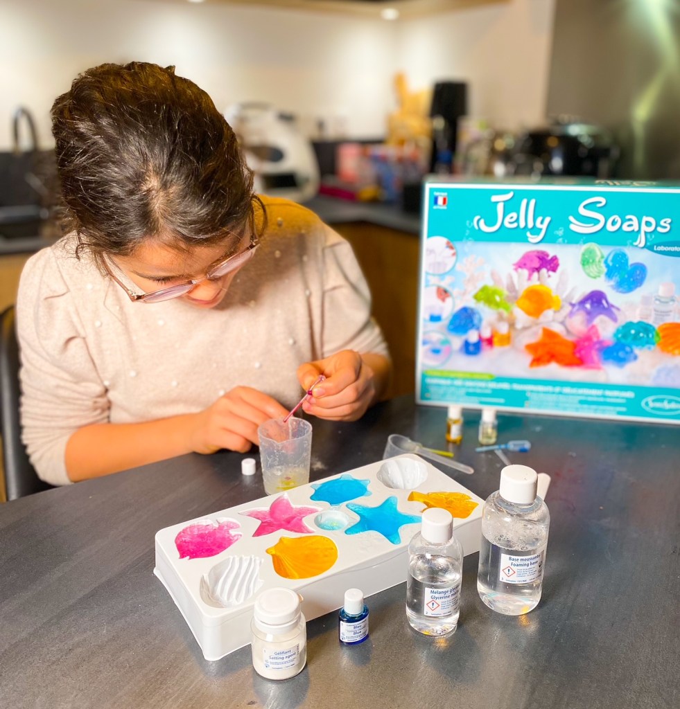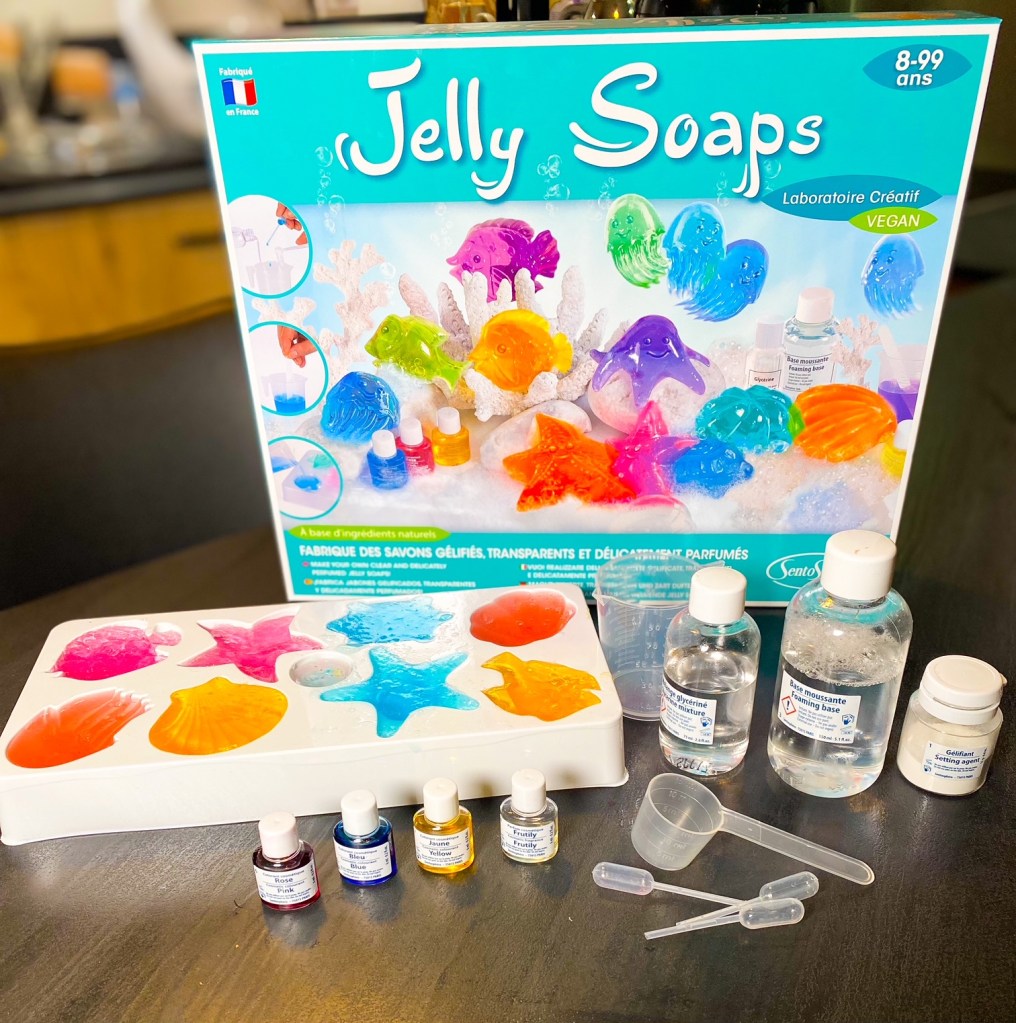 Ce kit cosmétique DIY contient tout le nécessaire pour fabriquer des savons gélifiés et délicatement parfumés en forme d’animaux marins ! Pour cela rien de plus simple : il suffit de mélanger la poudre gélifiante 100% d’origine naturelle avec de la glycérine, de la base moussante, du parfum et des colorants, de rajouter de l’eau chaude et de remuer quelques secondes. Il ne reste plus qu’à verser la préparation dans un moule et d’attendre 30 minutes qu’elle refroidisse avant de démouler les savons. Vos apprentis chimistes vont adorer se laver les mains avec sa texture si amusante.