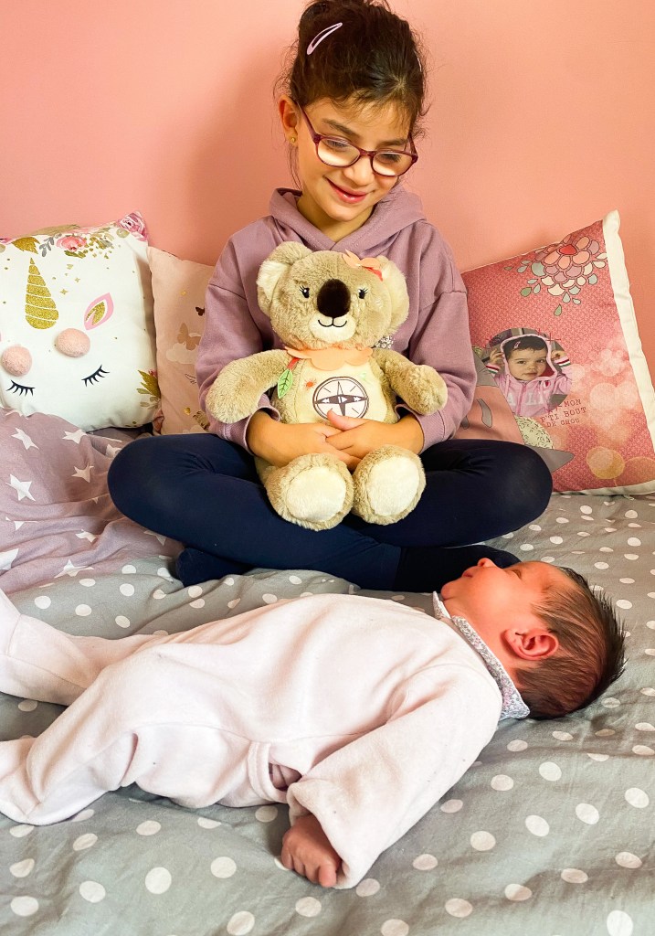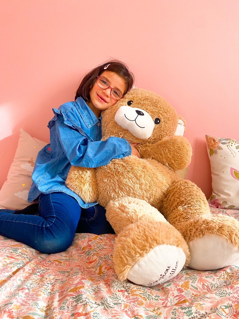 Piou Piou et Merveilles fabriquent des peluches toutes douces et 100% Made in France et notamment des peluches géantes. Nous avons craqué pour Gaston l’ourson, qui mesure jusqu’à 1,20 m. A la base, cette peluche était destinée à décorer la chambre d’Alba mais Tessa a flashé dessus et ne veut plus la lâcher. Elle dort même avec ! Je ne suis pas sûre qu’elle la rende un jour à sa petite sœur…