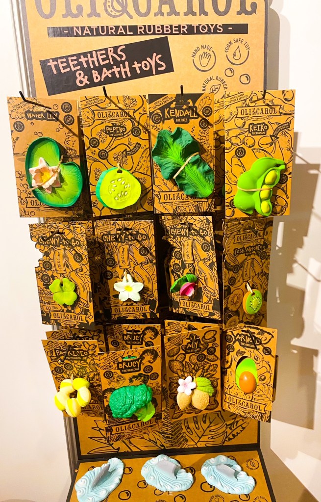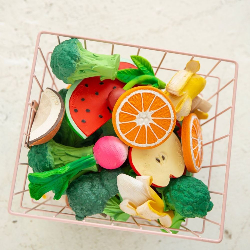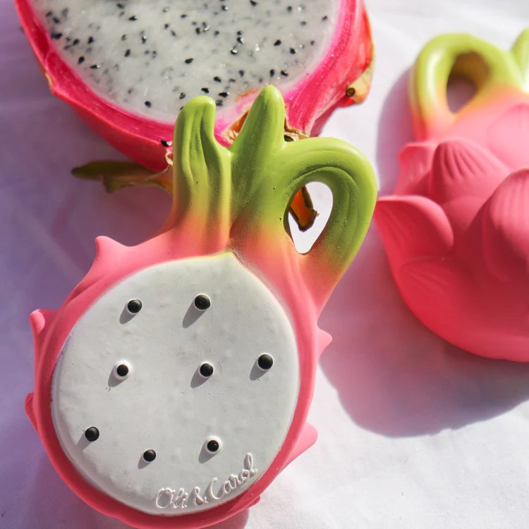 Fuschia le fruit du dragon, Ana la banane, Aly l’amande, John Lemon le citron, Sweetie la fraise… Bien plus que des anneaux de dentition, les fruits et légumes à mâchouiller de Oli & Carol sont des objets rigolos et respectueux de leur environnement. Composés à 100% de caoutchouc naturel, produits de façon artisanale et peints à la main avec des colorants alimentaires, ils sont non toxiques, sans PVC, sans BPA, sans phtalate et sans nitrosamine. Ils sont hygiéniques car ils ne contiennent pas de trous, éco-friendly et totalement sûrs pour les bébés et puis surtout ils sont très beaux !