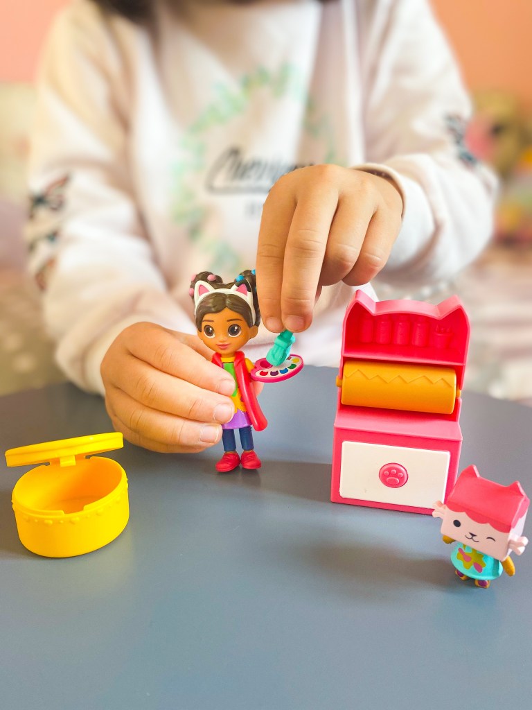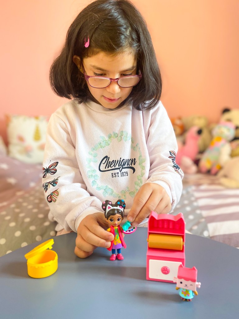 Si vous ne savez pas ce qu’est Gabby et la Maison Magique, il s’agit d’une série animée diffusée sur Netflix. Cette série met en scène une petite fille (humaine) qui, lorsqu’elle met un serre-tête avec des oreilles de chat, se transporte dans un monde en dessin animé, dans une maison de poupée, accompagnée de ses chats. Avec cette maison de poupée de 60 cm de haut, les enfants vont donc pouvoir se transporter également dans la Maison de Gabby en un instant ! Ma petite Tessa est fan de la série. Autant vous dire que quand elle a découvert l’existence de cette maison géante, elle l’a mis direct dans sa liste au Père Noël.