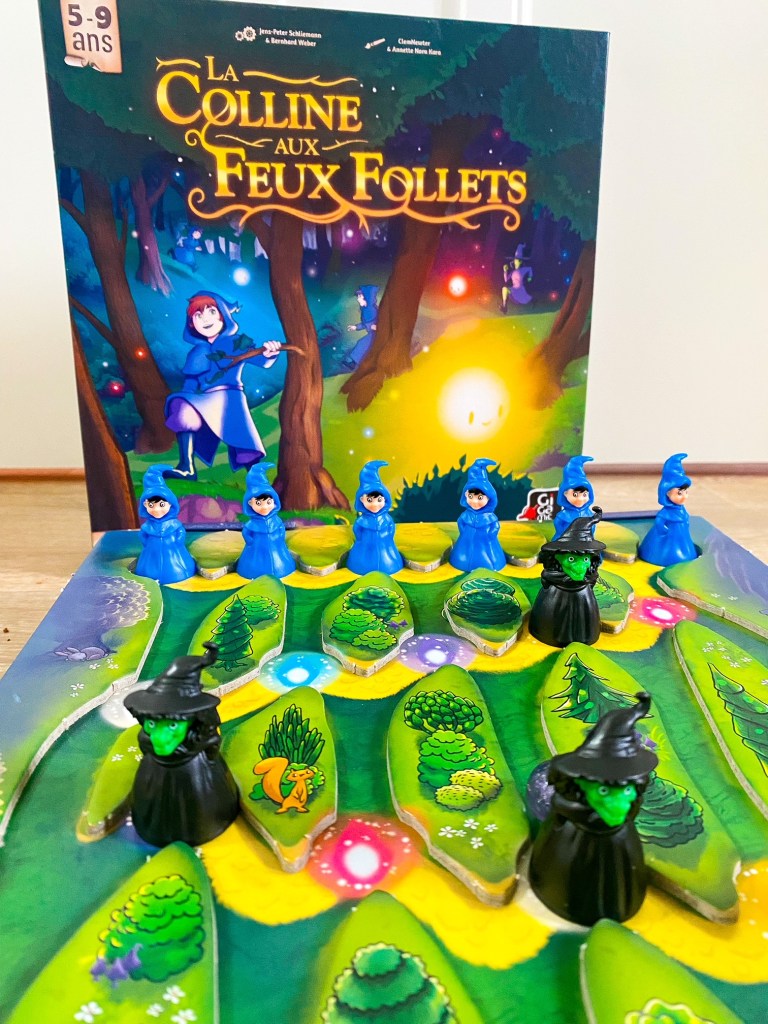De méchantes sorcières ont décidé de dérober le cristal magique du grand enchanteur! En tant qu’apprentis, vous devez les en empêcher et rejoindre le bas de la colline avant elles. Suivez les feux follets à travers les chemins sinueux de la forêt. Faites descendre les billes en déplaçant chaque figurine qu’elles touchent vers le point de couleur suivant jusqu’à ce que la bille arrive tout en bas. puis on pioche une autre bille et on recommence. Si les apprentis arrivent près de l’enchanteur avant les sorcières, c’est gagné ! Ce qui m’a plu dans ce jeu coopératif c’est d’bord son plateau de jeu incliné tellement original. Les règles du jeu sont super simples.
