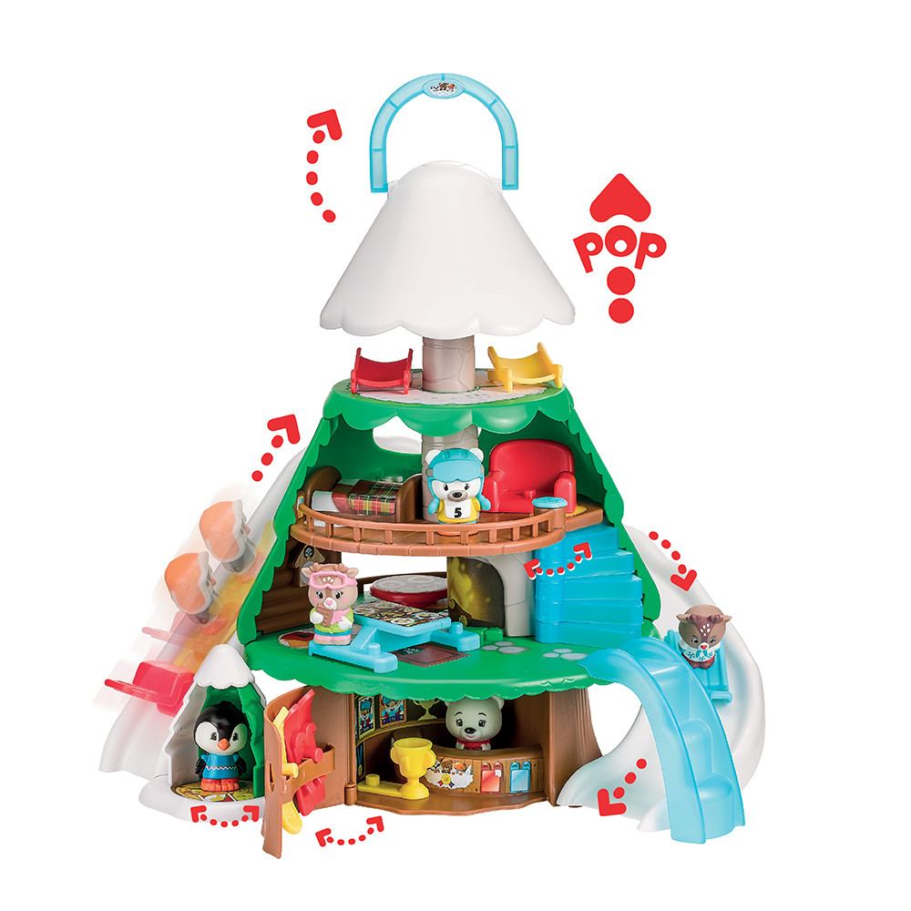 Tous en piste sur le Sapin Gla-gla Station de ski ! Que d’activités dans ce sapin ! Au rez-de-chaussée, la porte s’ouvre et laisse apparaître un ski shop avec de nombreux accessoires (ski, snowboard, luge, coupe). Au premier étage, un espace repas au coin du feu. Des escaliers rétractables permettent d’arriver au deuxième étage et à la chambre. Magique, en actionnant le toit pop-up un espace détente apparait au troisième étage avec des chaises longues. Rigolo, un remonte pente permet d’accéder au sommet du sapin et de dévaler la piste ! Amusant, un sapin cache-cache permet d’y glisser ses trésors.