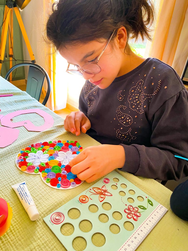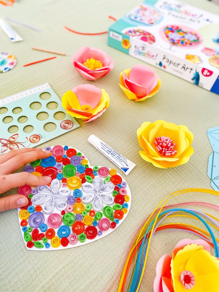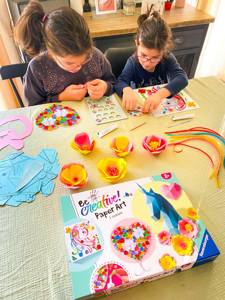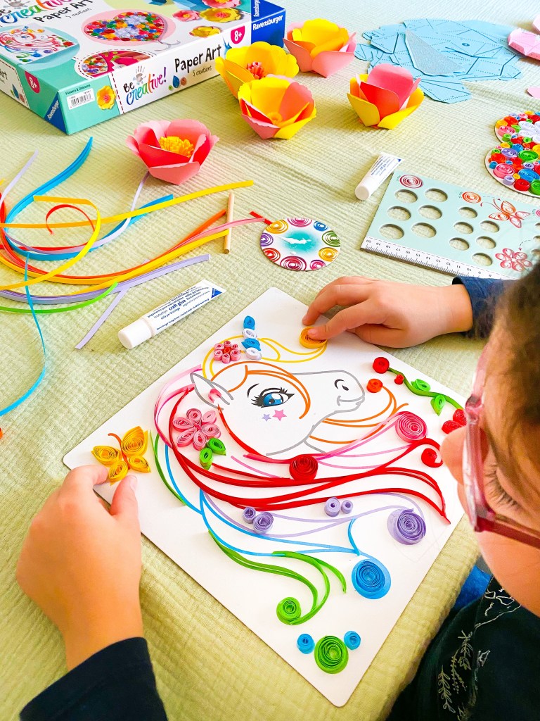 Grâce à la technique du quilling, qui consiste à enrouler des bandes de papier sur elles-mêmes, les filles ont réalisé une magnifique licorne et un cœur rempli de fleurs. L’activité pliage permet de réaliser des fleurs colorées, une grande licorne avec sa corne scintillante et un cœur en réalisations 3D. Toutes ces réalisations sont idéales pour décorer leur chambre ou à offrir aux proches.