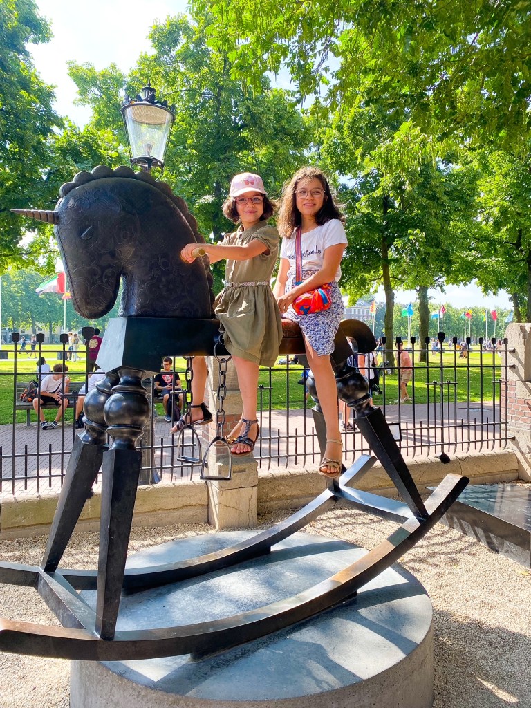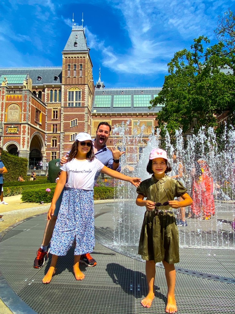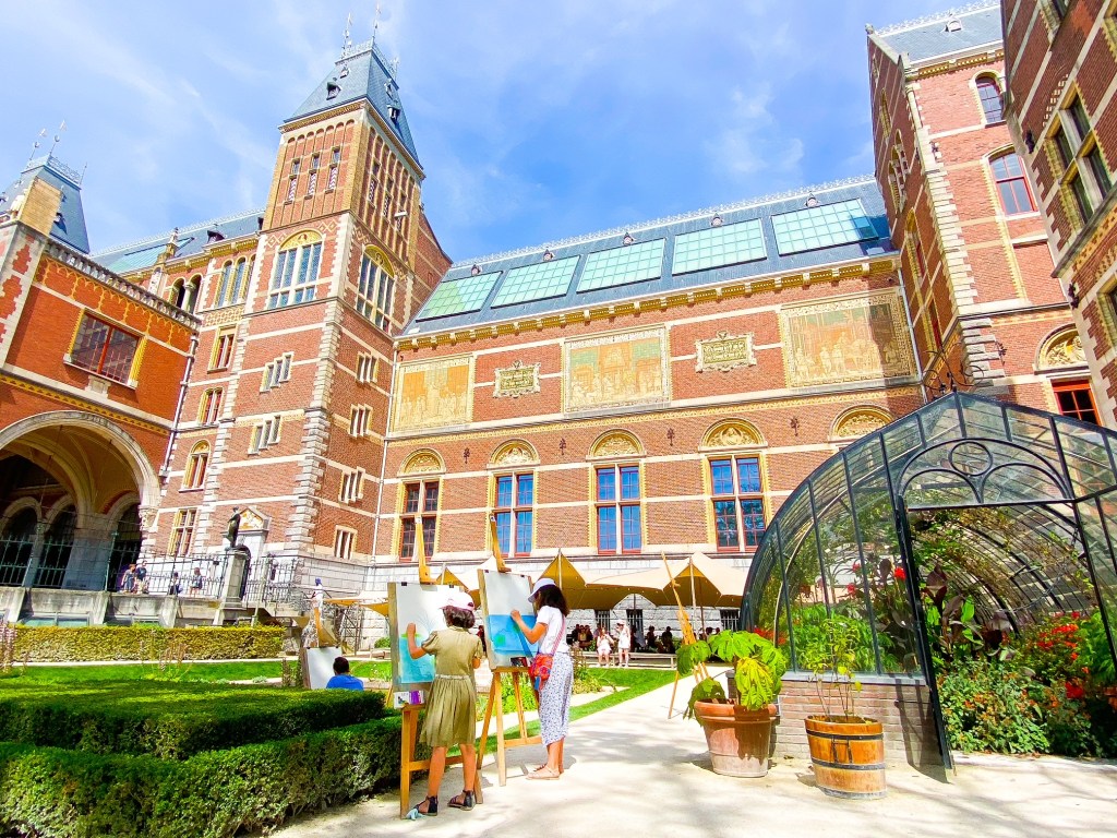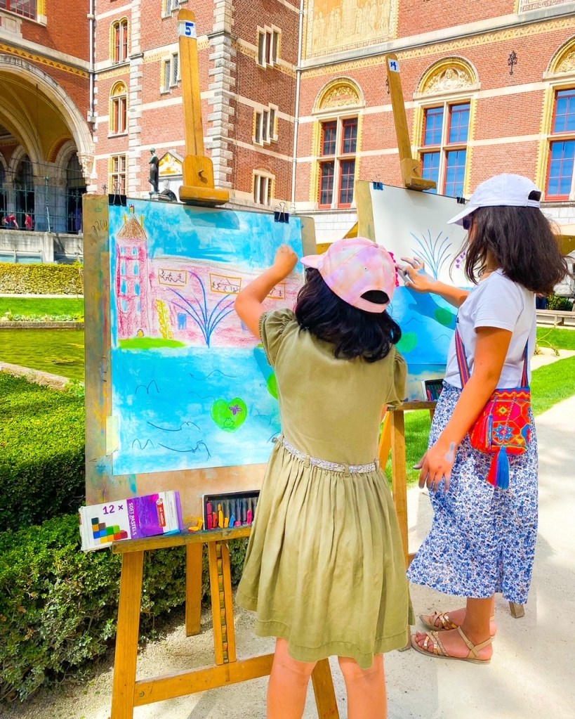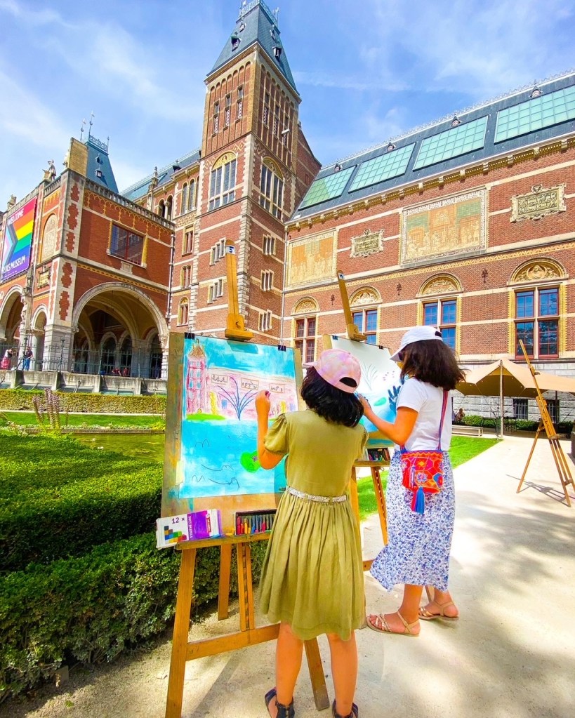 Pour rester dans le monde de l’art, nous avons aussi été nous promener aux abords du Riksmuseum et notamment dans les jardins et nous sommes tombés sur un atelier d’arts plastiques. Au pays de Van Gogh, Rembrandt ou Vermeer, il était tout à fait normal que les filles s’exercent à l’art. Et quel plus beau cadre que celui des jardins du Rijksmuseum. L’accès au jardin est gratuit mais l’atelier coûte 5€. Adultes et enfants peuvent s’adonner au dessin au pastel et reproduire le magnifique spectacle de verdure et d’architecture qui s’offrent à eux dans ce décor de carte postale.