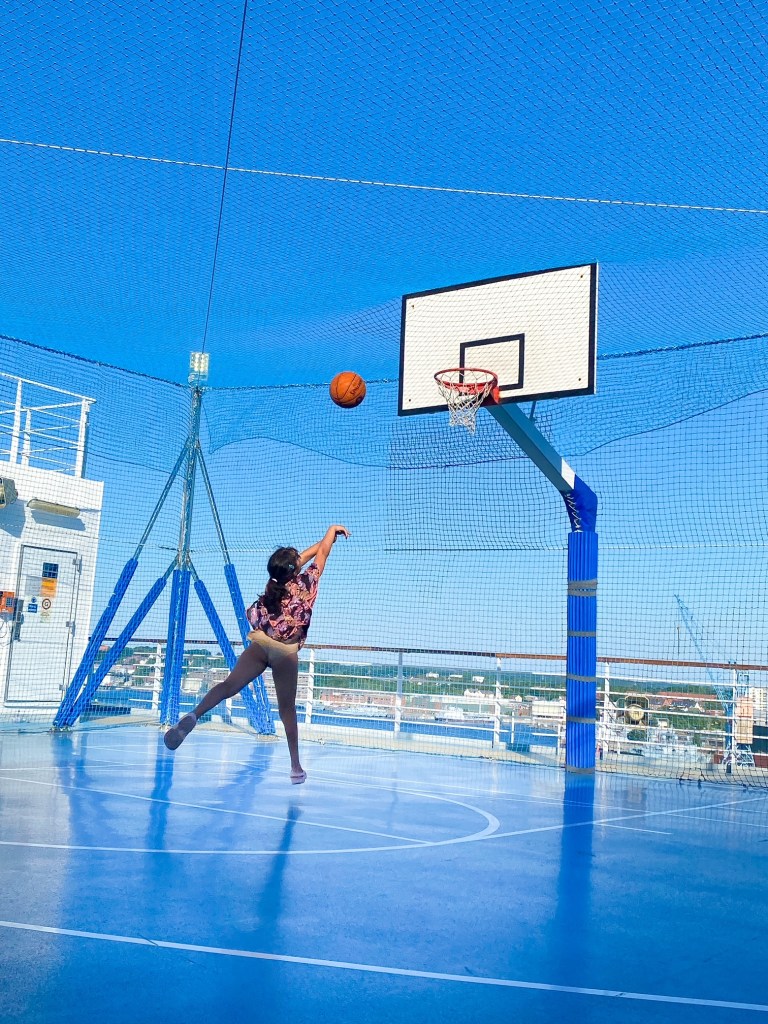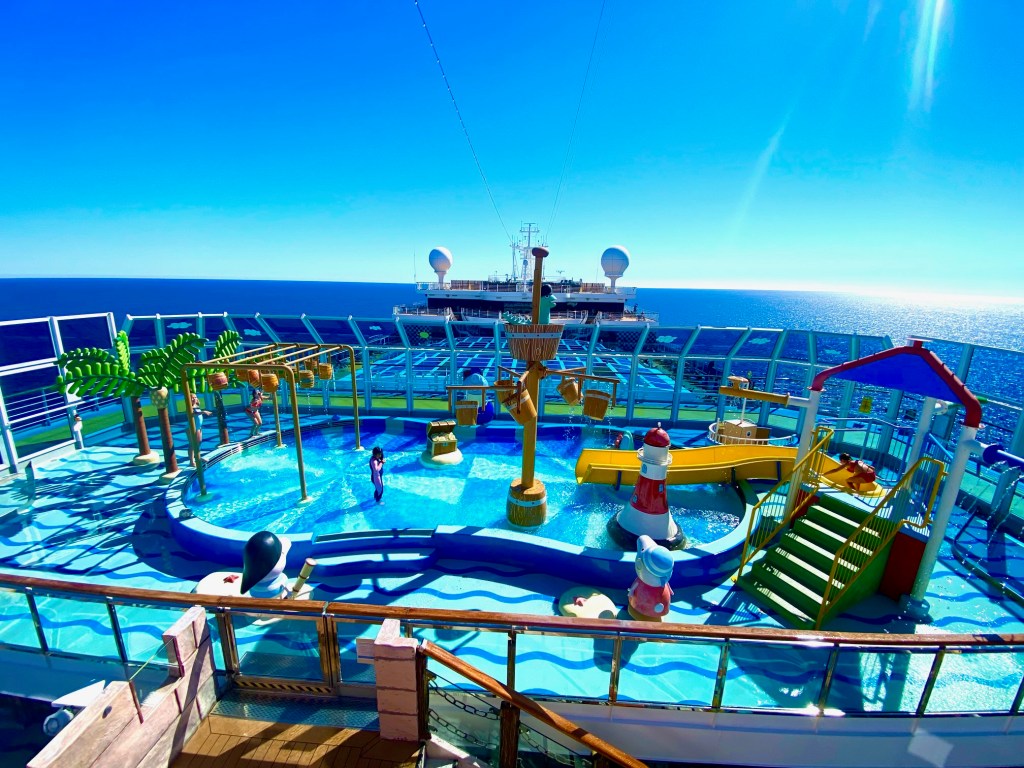 Nous ne nous sommes pas du tout ennuyé ! Les filles ont pu profiter des aires de jeux aquatiques sur le thème de Peppa Pig mais pas des piscines car l’eau était trop froide. Elles ont joué au basket sur les terrains de sport situés sur le pont supérieur du bateau. Elles ont aussi participé aux nombreuses animations du kids-club.