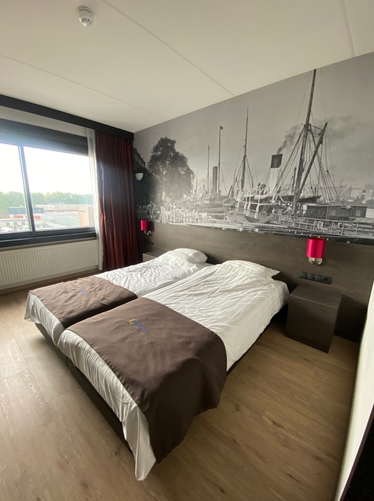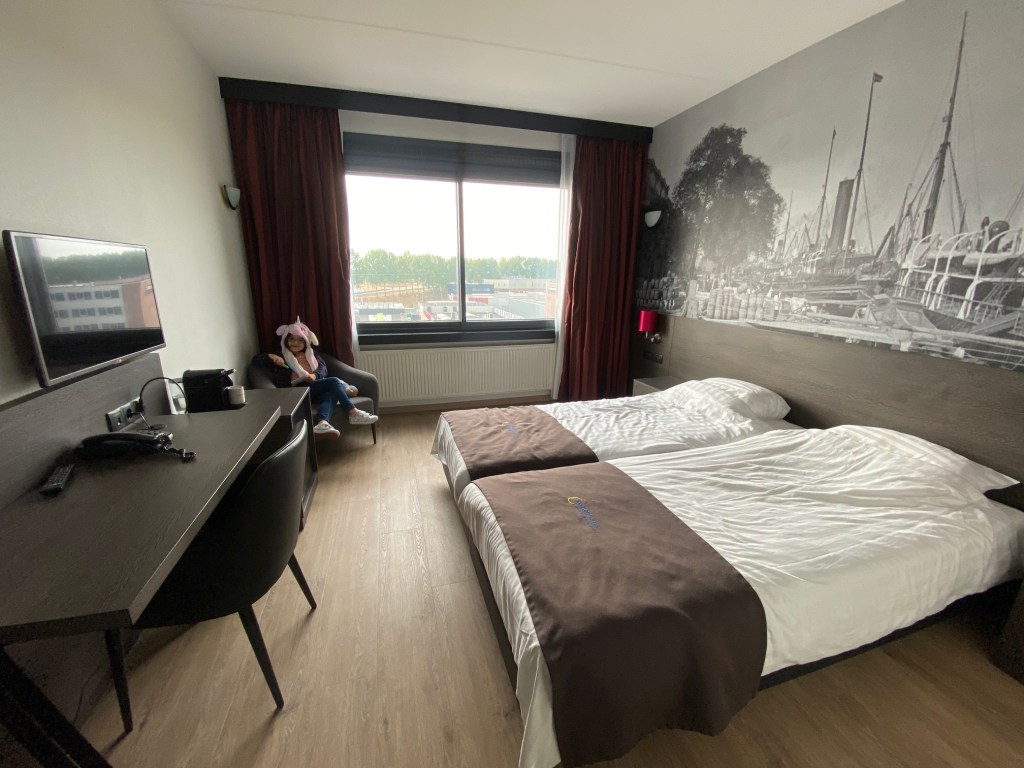 Nous avons dormi dans un hôtel, en périphérie de Rotterdam, le Bastion Hotel Barendrecht (150€ la nuit), à 20 minutes de Kinderdijk. L’hôtel était confortable mais il n’y avait pas de chambre familiale du coup nous avons pris 2 chambres côte à côte.
