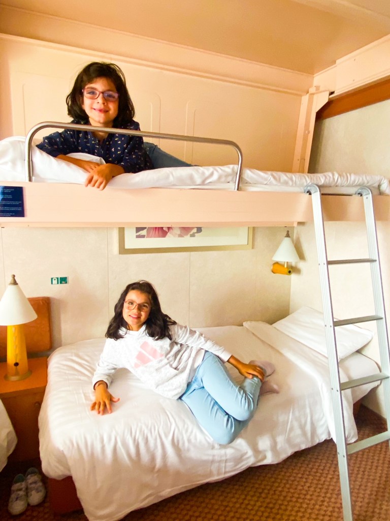 Notre cabine était super confortable avec un grand lit double pour Papa Bougeotte et moi et un lit superposé pour les filles, un placard et une petite salle de bain-WC. Nous avions une petite TV mais il n’y avait qu’une chaîne française (TV5 Monde), la clim’ et un sèche cheveux.