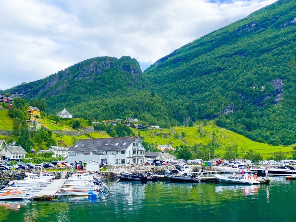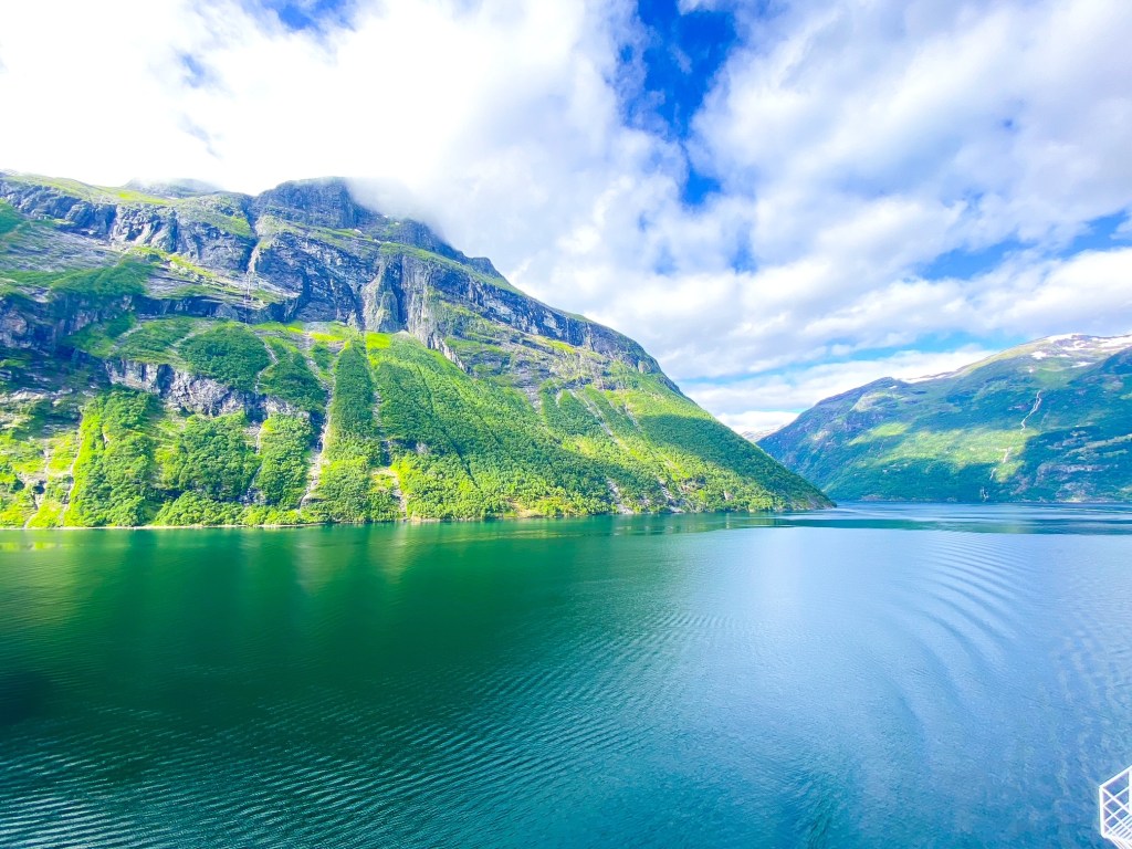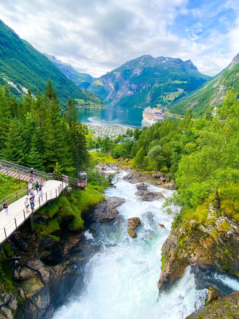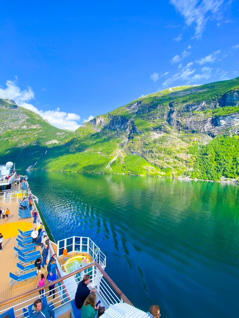 Après 38h de navigation, nous avons enfin atteint le fjord de Geiranger. Comme je vous l’ai dit juste avant, nous n’avons pas pris d’excursions car nous voulions être indépendants (la seule contrainte : être de retour sur le bateau à 18h avant qu’il ne largue les amarres (d’ailleurs sachez que si vous n’êtes pas à l’heure à bord, le bateau ne vous attendra pas… Vous imaginez la galère ! ). Nous avons admiré le fjord depuis le pont supérieur du paquebot et c’était vraiment sublime avec une vue à 360 degrés. Du coup pas la peine de payer une excursion pour découvrir cette beauté. Nous avons eu de la chance car il faisait un temps magnifique. D’ailleurs, au mois d’août alors que toute la France souffrait de la canicule, nous nous avions une température d’environ 15 degrés.