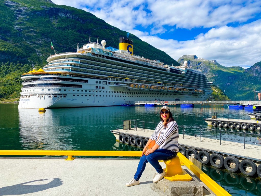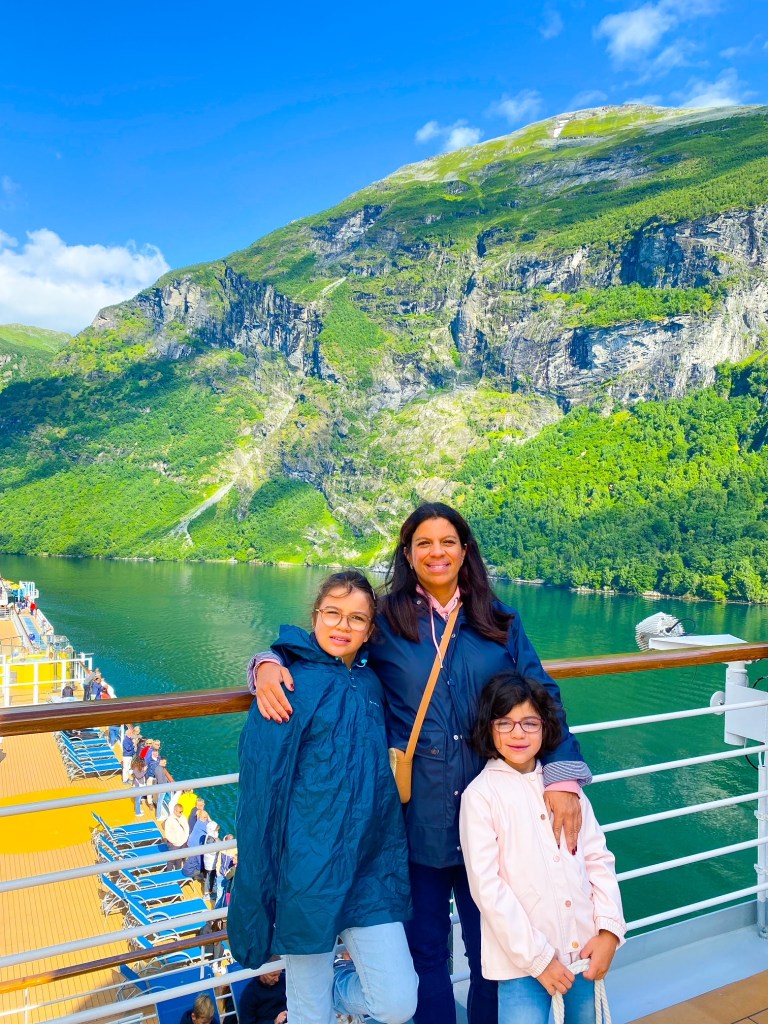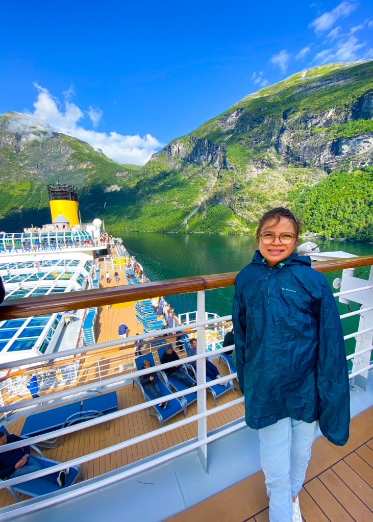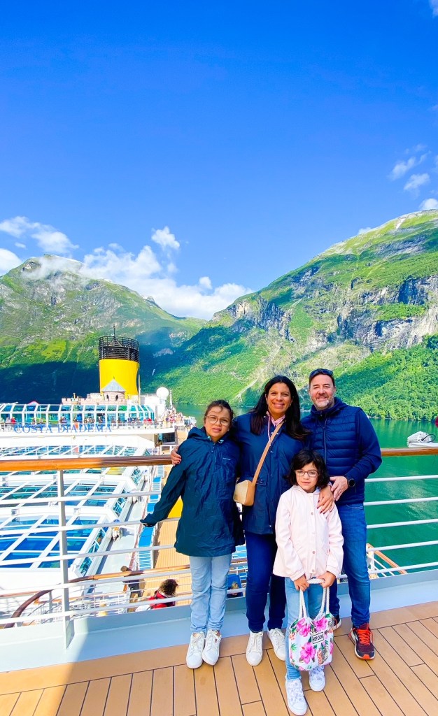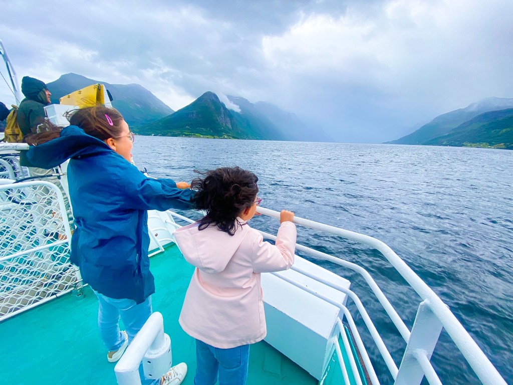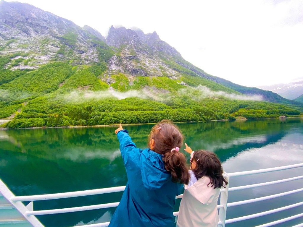Nous avons passé le 1er jour de notre croisière en mer pour rejoindre le plus beau fjord de Norvège, Geiranger. J’avais peur de m’ennuyer toute une journée enfermée dans le bateau mais pas du tout. Il y a tellement de choses à faire ! C’est une véritable petite ville flottante avec des restaurants, des boutiques, des bars, un théâtre, des piscines, un casino, un cinéma, un spa, des terrains de sport, des discothèques et même un hôpital. On ne s’est même pas ennuyé une seconde ! Déjà le 1er jour, il faut apprendre à se repérer à l’intérieur de ce monstre des mers, trouver son restaurant attitré pour le dîner, réserver des excursions et inscrire les enfants au kids club… D’ailleurs, je ne vous conseille pas forcément de prendre les excursions Costa car nous les avons trouvé assez chères. Il vaut mieux que vous visitiez par vos propres moyens. Nous avons juste pris une excursion en bateau à Hjørundfjord.
