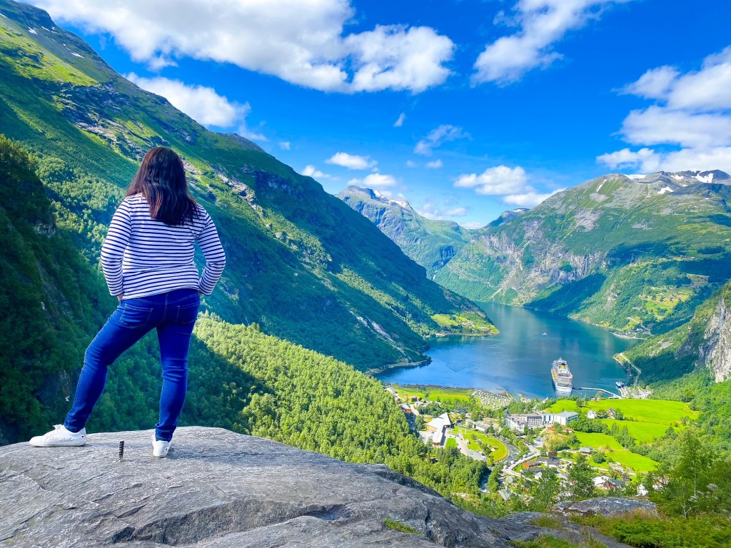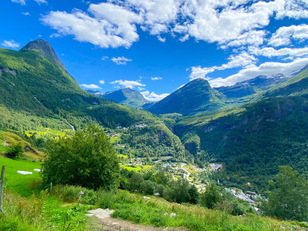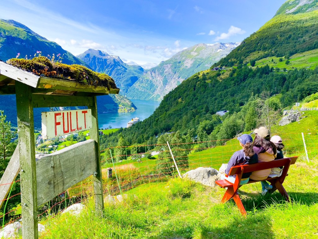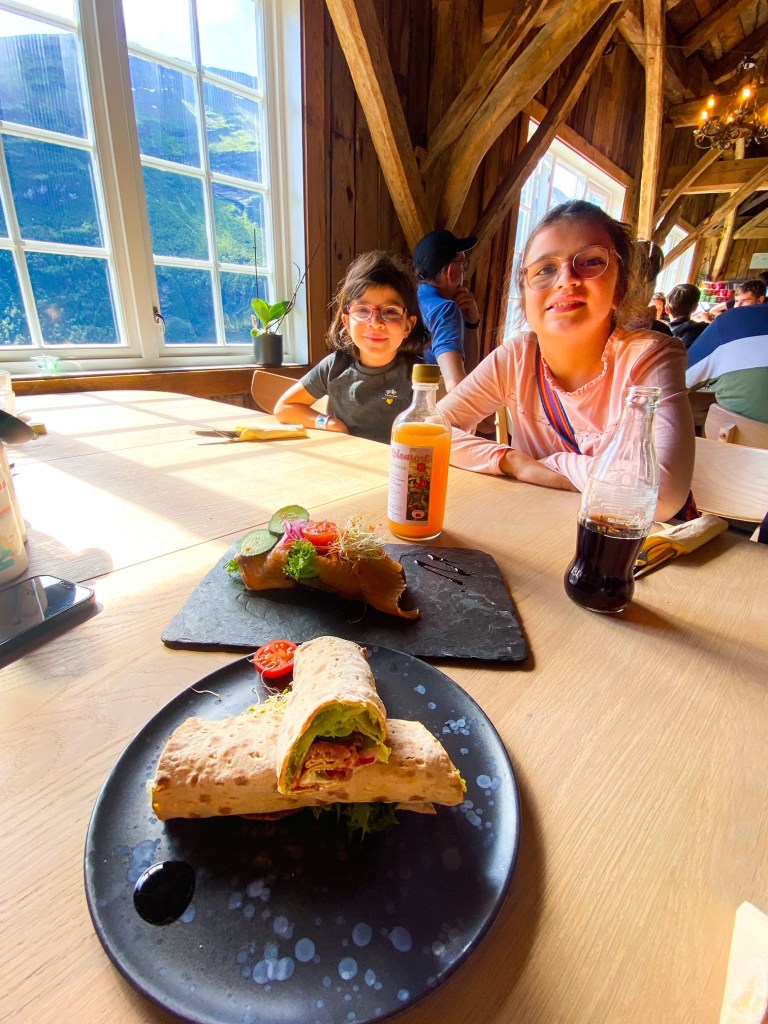 Nous sommes sortis du bateau et nous avons acheté un tour en bus sur le stand CitySightseeing. Le bus nous a amené jusqu’au magnifique point de vue de Flydalsjuvet avant de nous déposer pour une petite randonnée de 15 minutes jusqu’à la ferme Westeras Farm où nous avons mangé un petit encas avec des produits locaux. Nous sommes ensuite redescendus pour admirer les magnifiques cascades en contre-bas, situées près du centre d’informations des fjords, Fossevandring Geiranger. Et nous avons terminé la journée en faisant du shopping sur le port. Nous avons acheté du saucisson de rennes (nous n’avons pas aimé car nous avons trouvé le goût trop fort). Ils vendent aussi de super vêtements techniques et thermiques, parfaits pour le ski et nous avons trouvé que les prix étaient raisonnables alors que pourtant la Norvège est réputée pour être un pays extrêmement cher.
