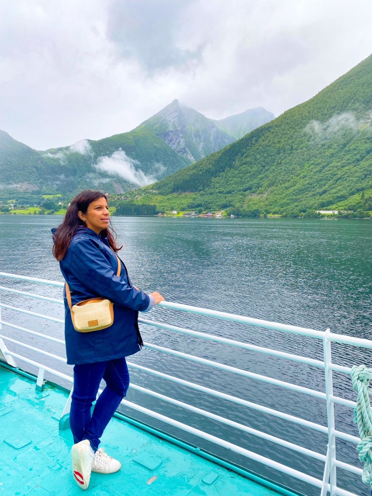 Nous avons fait escale à Alesund, un important port de pêche. Le matin, nous avons fait une excursion Costa payante en bateau direction Hjørundfjord. Malgré une météo peu clémente avec pluie et vent glacial à décorner un bœuf, on a adoré cette excursion dans ce fjord sauvage et majestueux, noyé dans la brume, qui lui conférait une atmosphère particulière, très mystique. Dans cette partie de la Norvège, il y a seulement 20 jours de soleil par an et une eau à 4 degrés toute l’année ! Nous avons parcouru un bras de la mer de 33 km au cœur des pics pointus des Alpes de Sunnmøre. On a pu admirer les parois rocheuses abruptes, quelques fermes isolées jusqu’au petit village de Øye,