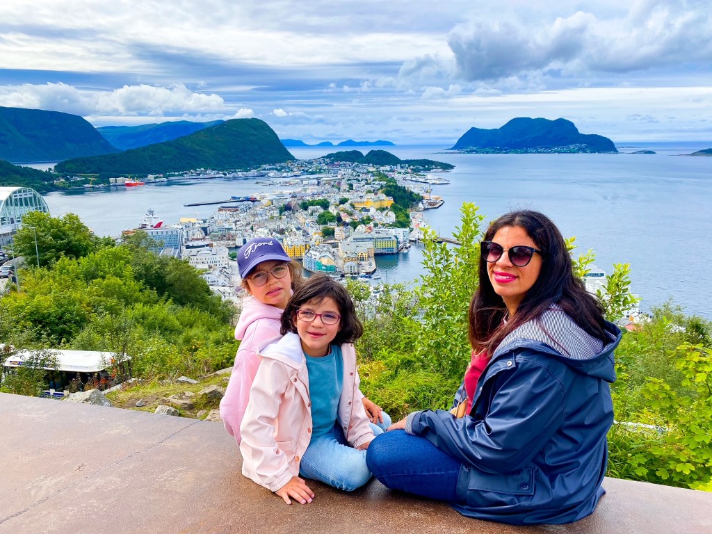 Après l’excursion, nous sommes retournés déjeuner sur le paquebot avant de repartir explorer la ville d’Alesund l’après-midi. Nous avons opté pour une visite en petit train. La ville en elle-même n’a pas grand intérêt même s’il y a de de très belles façades de style Art Nouveau. Ce que nous avons préféré c’est admirer le beau panorama depuis le belvédère de la colline Fjellstua. On peut y accéder à pied depuis le centre-ville mais il faut gravir 418 marches. Nous avons bien fait de prendre le train ! La vue sur la ville et les fjords environnants est magnifique !