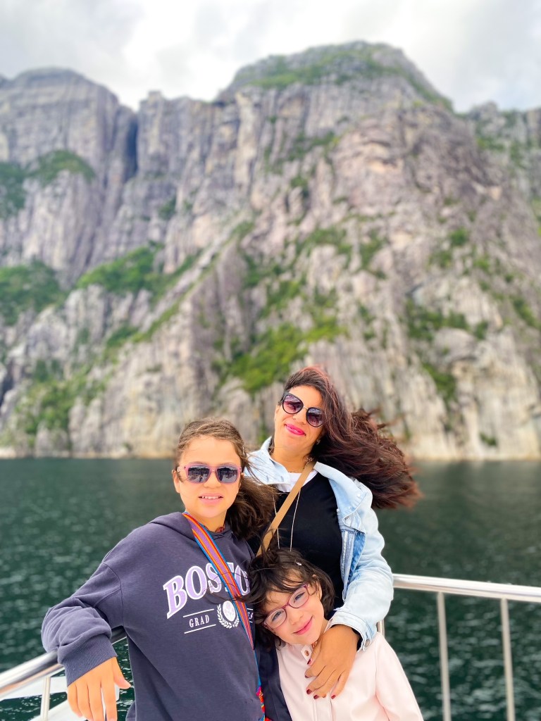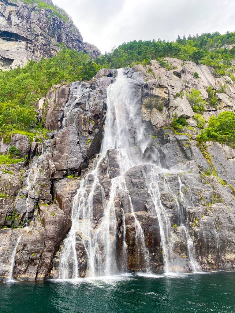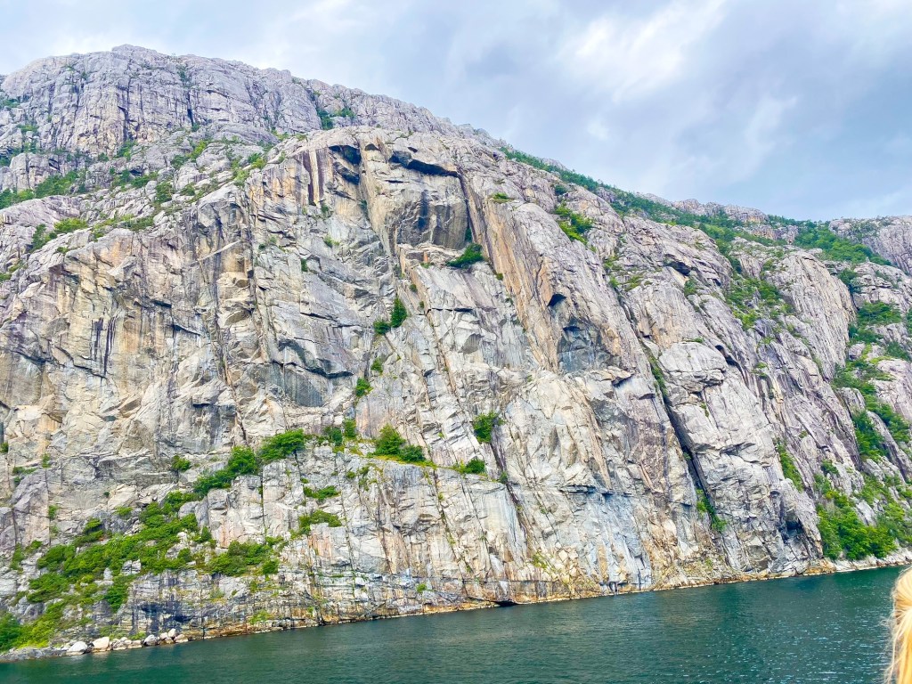 Nous avons pris une excursion sur le port de Stavanger direction Lysefjord. C’est dans ce fjord que se trouve le Preikestolen (le rocher de la Chaire) où a été tourné l’une des scènes du dernier Mission Impossible d’où lequel s’est élancé Tom Cruise lors d’une spectaculaire cascade. Pour l’admirer, il aurait fallu faire une randonnée plutôt périlleuse (incompatible pour nous avec ma grossesse et nos enfants) mais la vue a l’air dingue depuis ce promontoire de 600 m² surplombant le fjord à 600 mètres de hauteur.