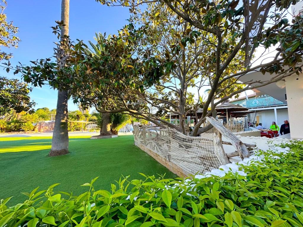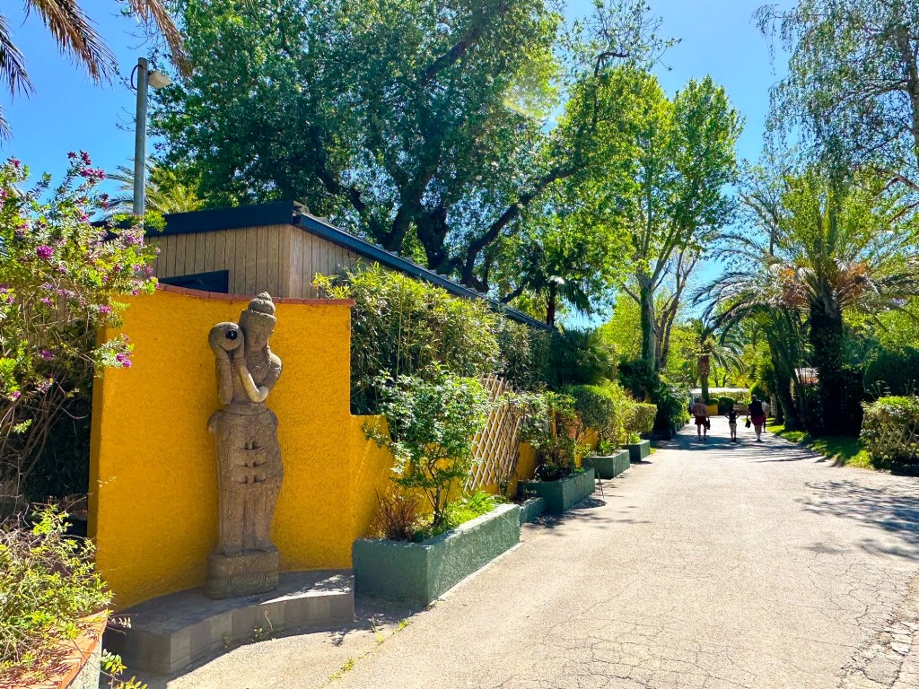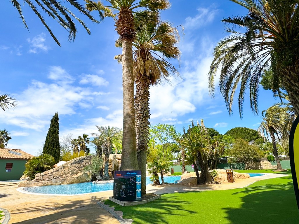Notre cottage était situé dans une allée piétonne tranquille bordée de plantes luxuriantes. On se serait cru sous les tropiques avec les palmiers, les bananiers et les oliviers ! Il était à proximité du parc aquatique et de toutes commodités du camping (supermarché, boulangerie, glacier, bureau de presse, magasin de souvenirs, rôtisserie, restaurants, bar, salle de spectacle…). Pas besoin de traverser tout le camping pour aller se baigner ou faire des courses sachant que le camping s’étend sur 23 hectares (1 000 mobile homes).