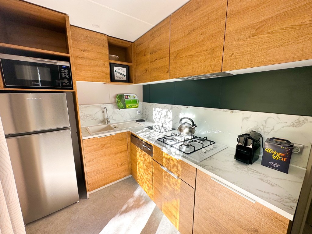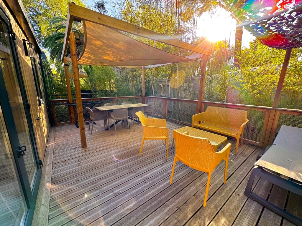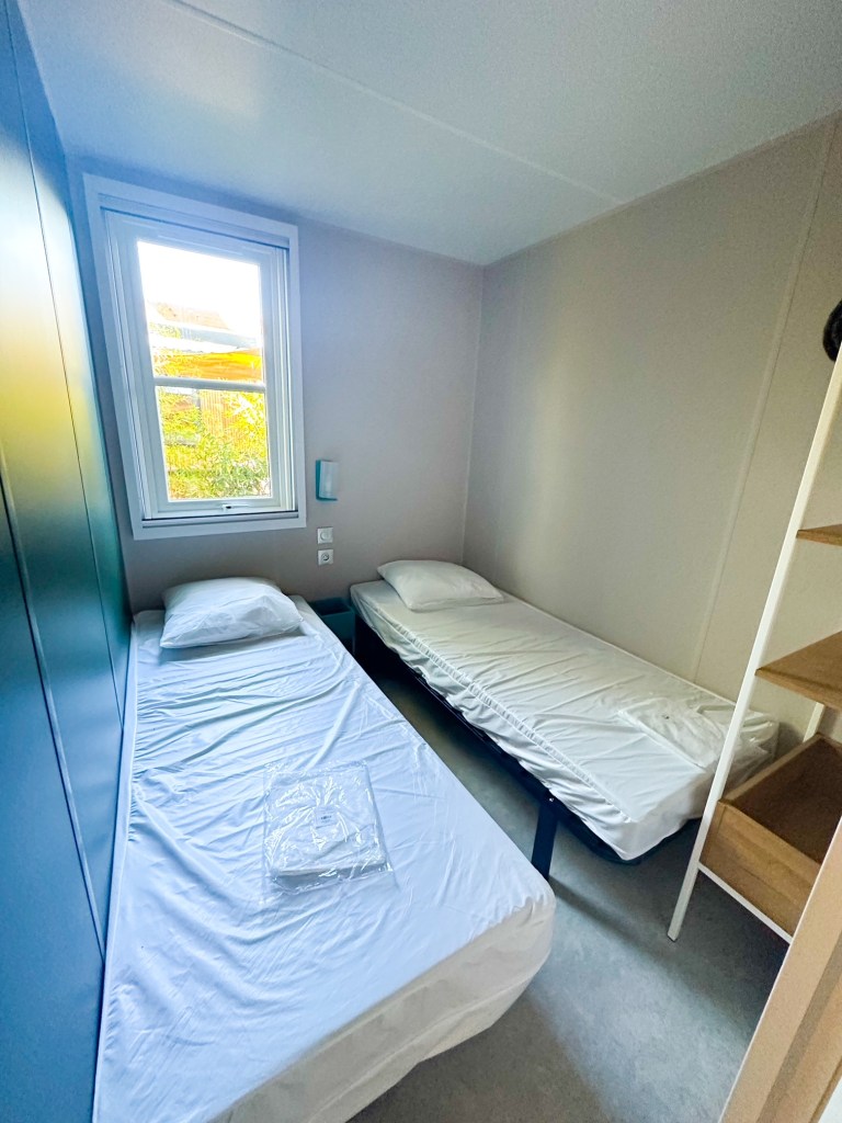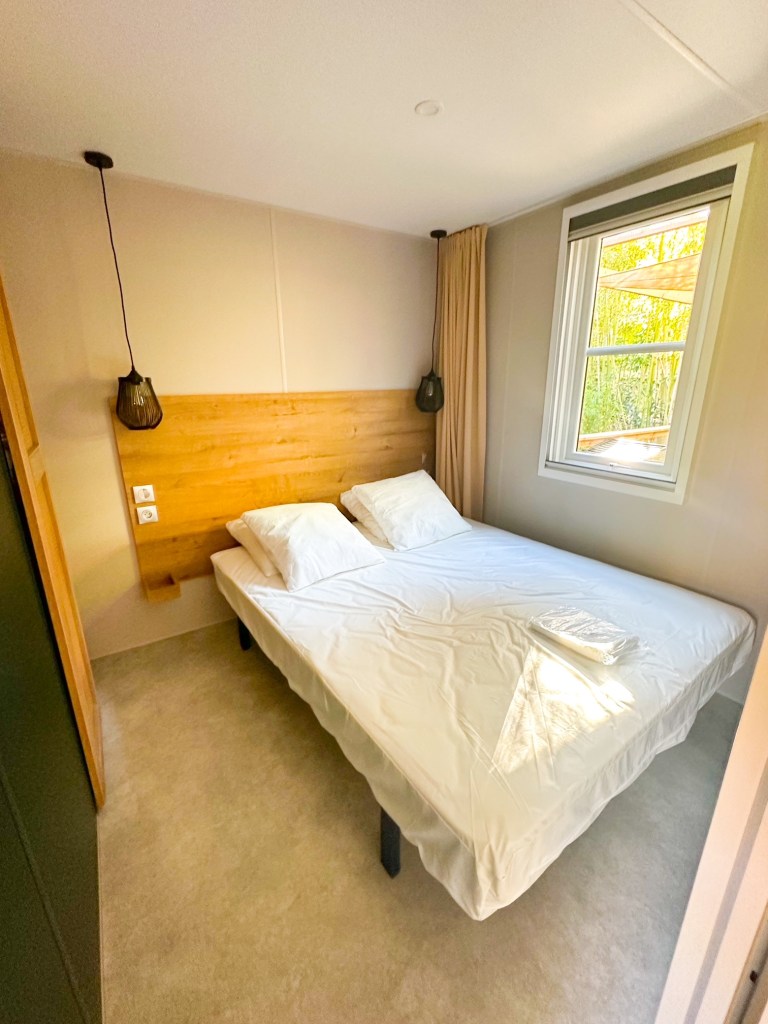 Nous avons réservé notre séjour fin février et nous avons eu la chance de pouvoir louer un Lodge Prestige de 35m2 avec 2 chambres (4/6 personnes) à un prix hyper intéressant : 750€ la semaine (contre 2 100€ la semaine l’été). Je n’avais jamais vu de mobile home aussi moderne et design. Même la déco était stylée ! Gros coup de cœur pour la terrasse XXL et sa cuisine d’été avec sa plancha au gaz et son évier, sa grande table pour manger dehors, son coin salon de jardin cosy mais aussi ses transats. A la base, on voulait réserver un lodge plus grand avec 3 chambres et 2 salles de bain (40m2) mais malheureusement il n’y en avait plus. Du coup, nous avons pris le kit bébé (gratuit) avec un lit parapluie, une chaise haute et une baignoire. Alba a dormi avec nous dans la chambre parentale.