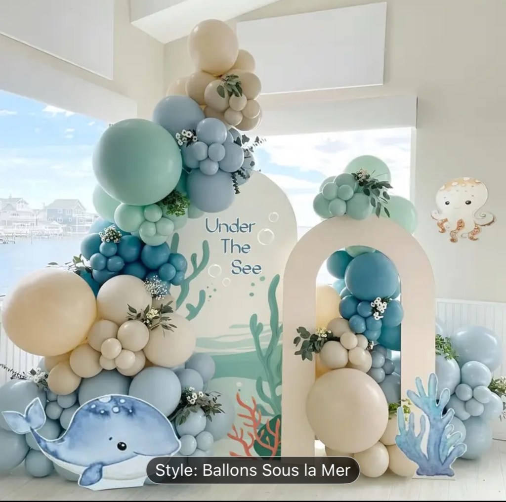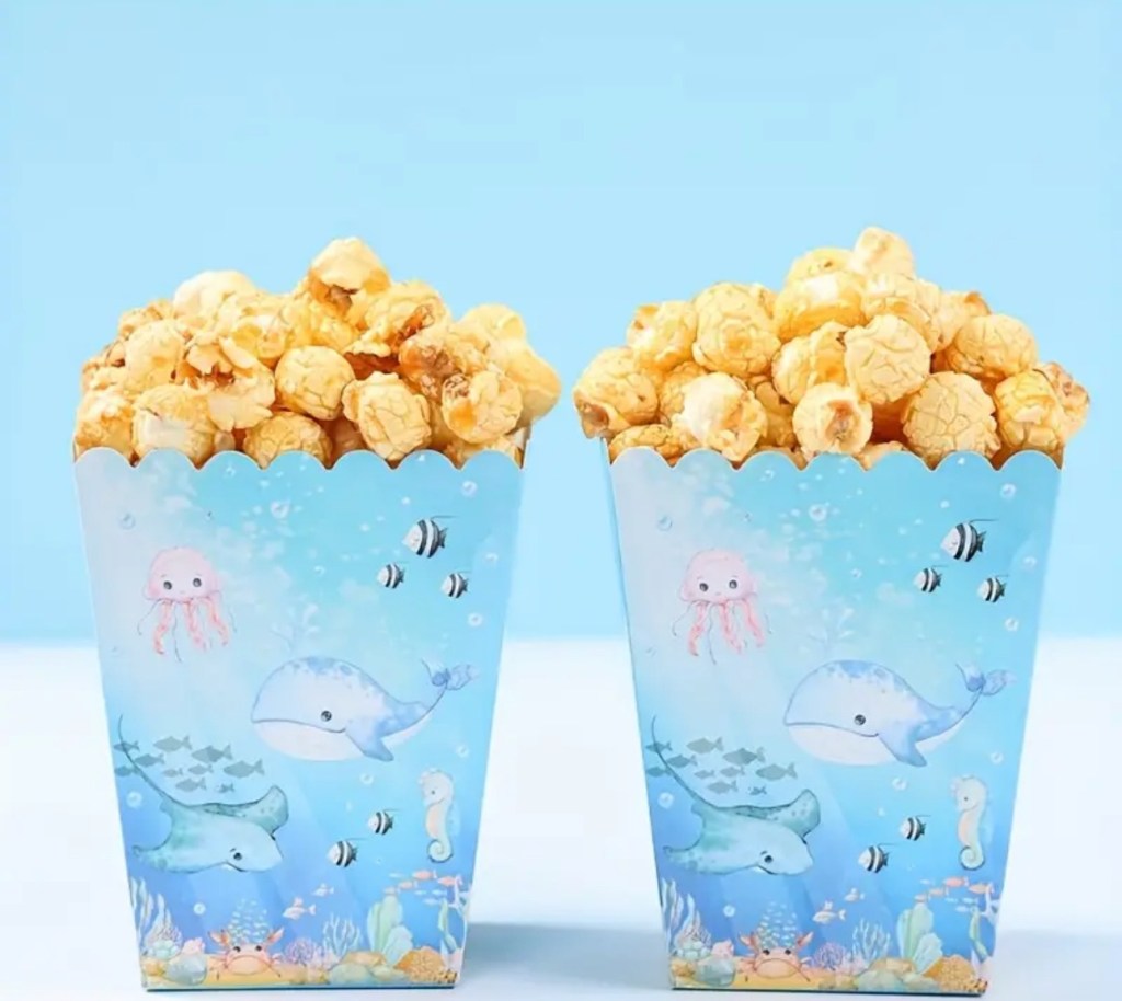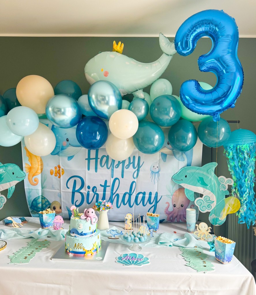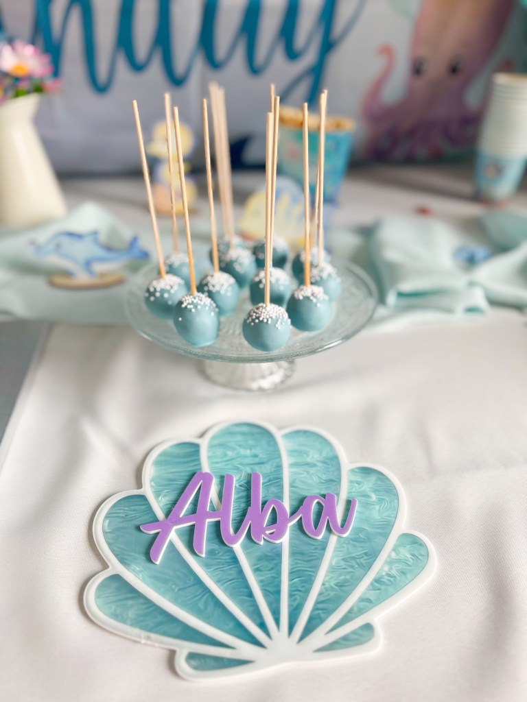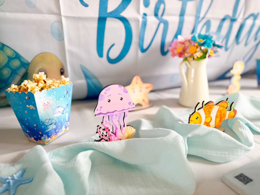 J’ai ensuite complété avec des achats sur Temu. J’ai commandé une bâche à mettre en fond de la table du buffet, des méduses à accrocher sur ma barre de table sur laquelle je fixe la déco, des contenants pour pop-corn, un kit pour arches de ballons et des décorations à poser sur la table en forme d’animaux marins et un coquille Saint-Jacques personnalisée au nom d’Alba.