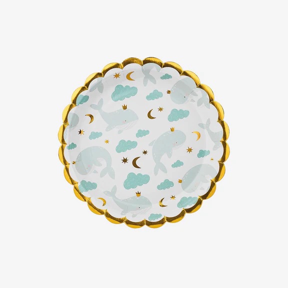 J’ai choisi la déco sur les animaux de la mer sur le site My Little Day : petites assiettes en carton, cake toppers, ballon en forme de baleine que j’ai gonflé à l’hélium, des ballons bleus, des serviettes en forme de baleine, un chemin de table bleu en gaze de coton pour recréer une sorte de vague.