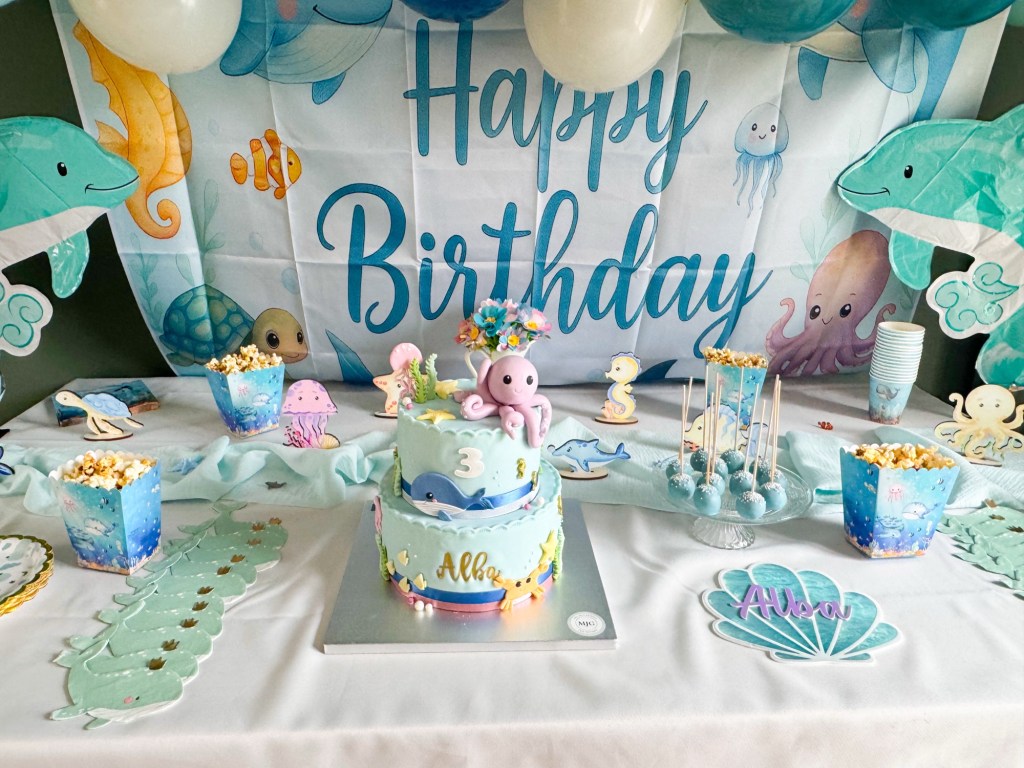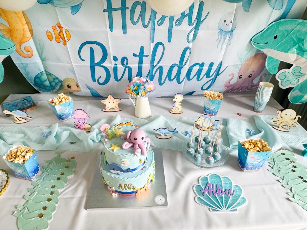 Poissons, dauphins, requins, pieuvres, tortues de mer, méduses… Pour la fête d’anniversaire de ma petite Alba, j’ai choisi le thème des animaux marins. Je trouve que c’est un thème super mignon pour un enfant de 3-4 ans, filles ou garçons.