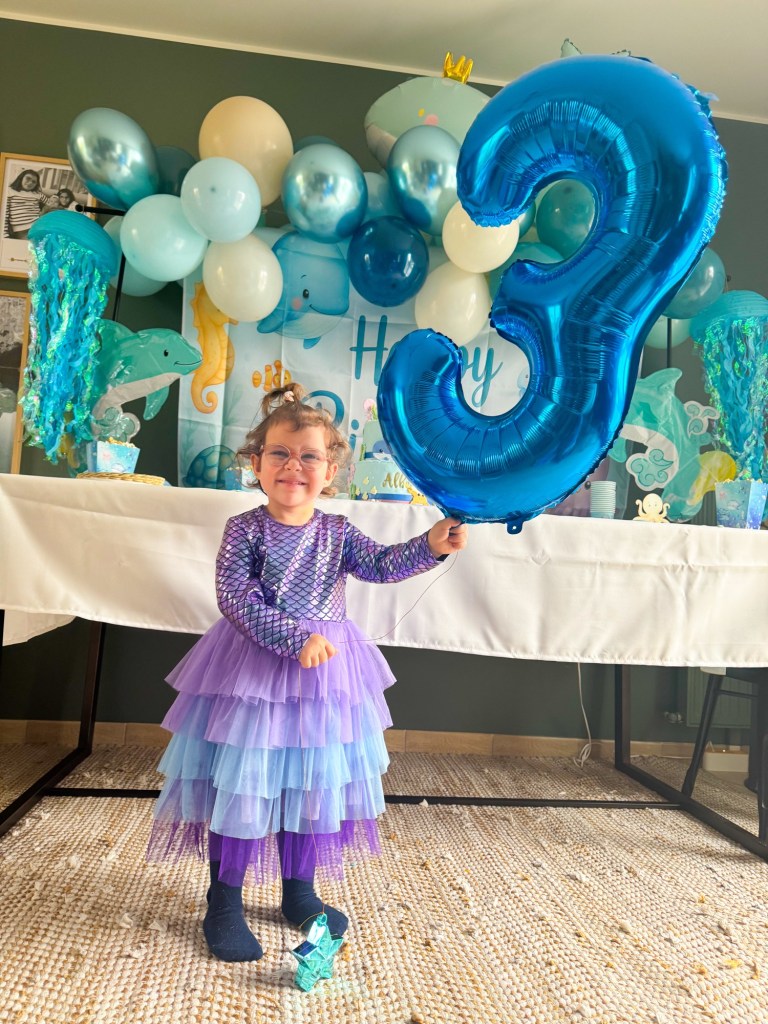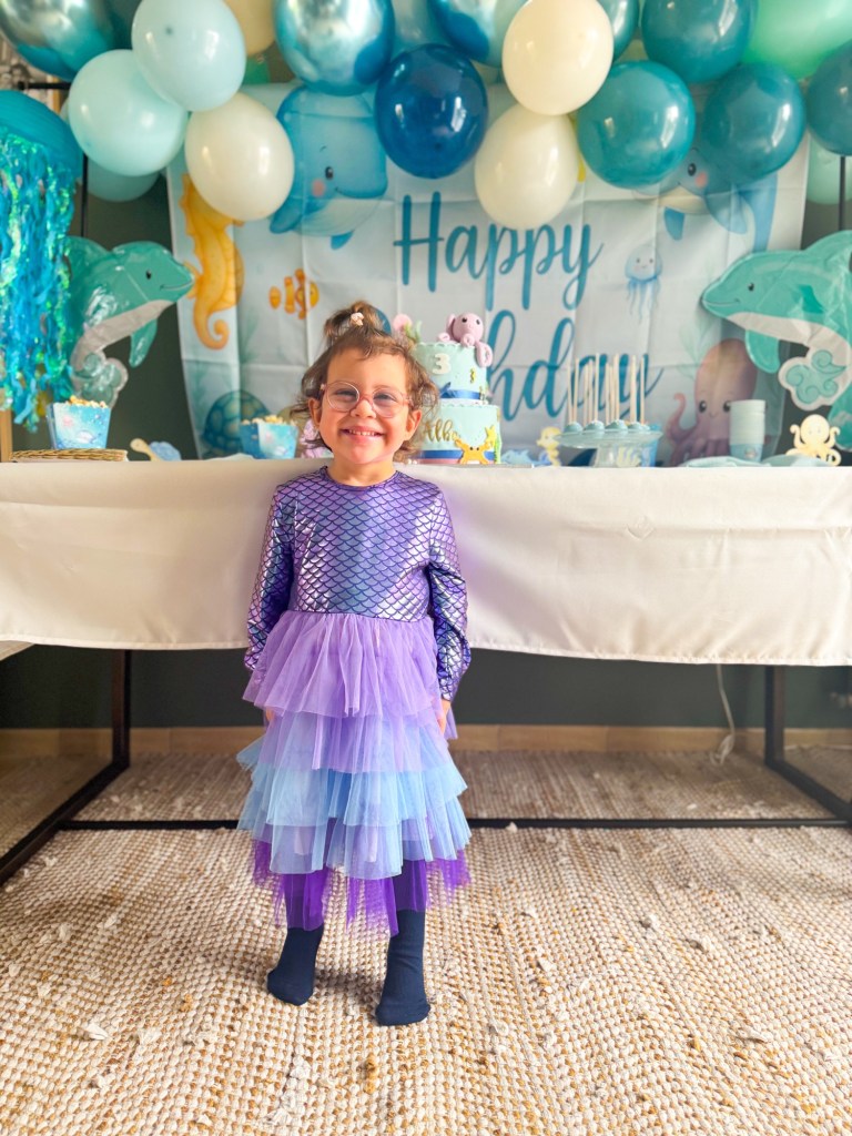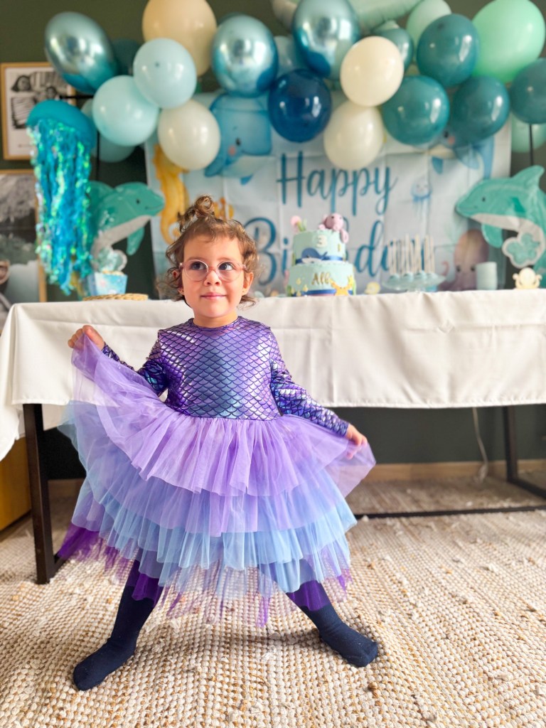 Pour rester dans le thème de la déco, j’ai acheté une jolie robe sirène sur Amazon en tulle et avec des motifs écailles à ma petite Alba.